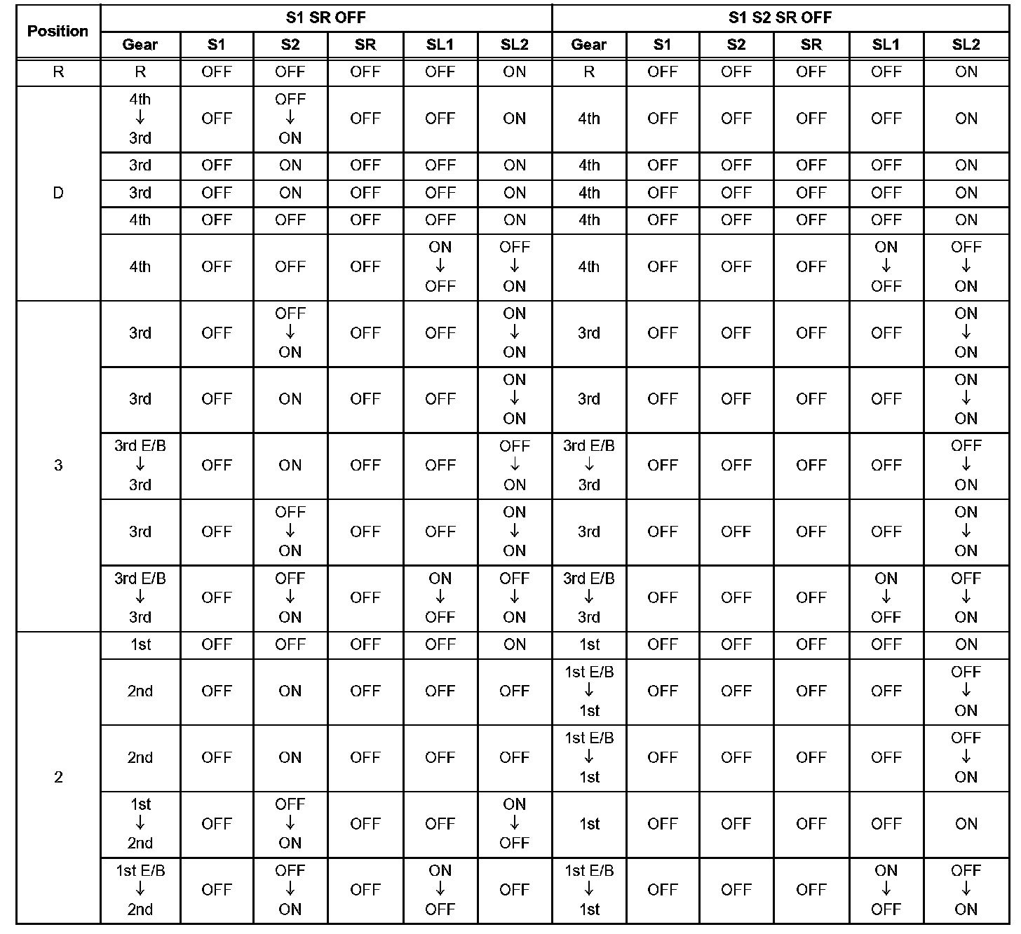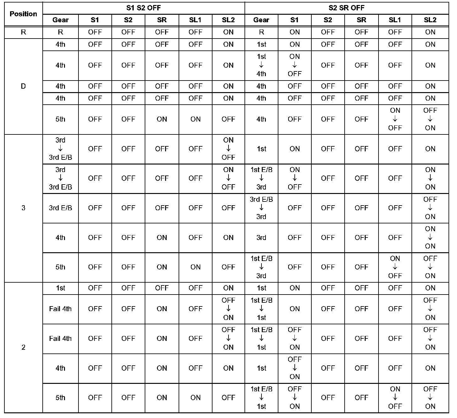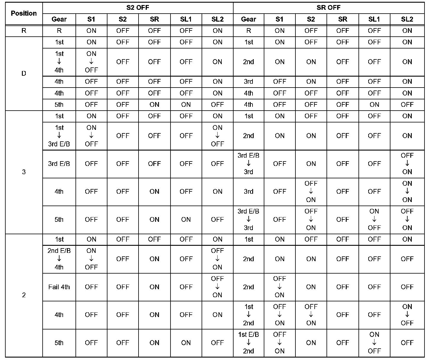 If either of the shift solenoid valve circuits has an open or short failure, the ECM turns the other shift solenoid ON and OFF in order to shift into the gear positions shown in the table.