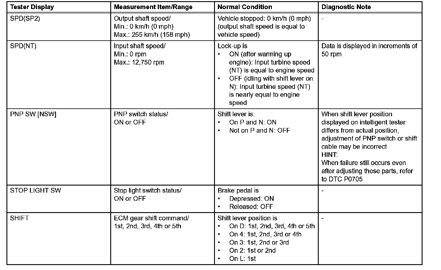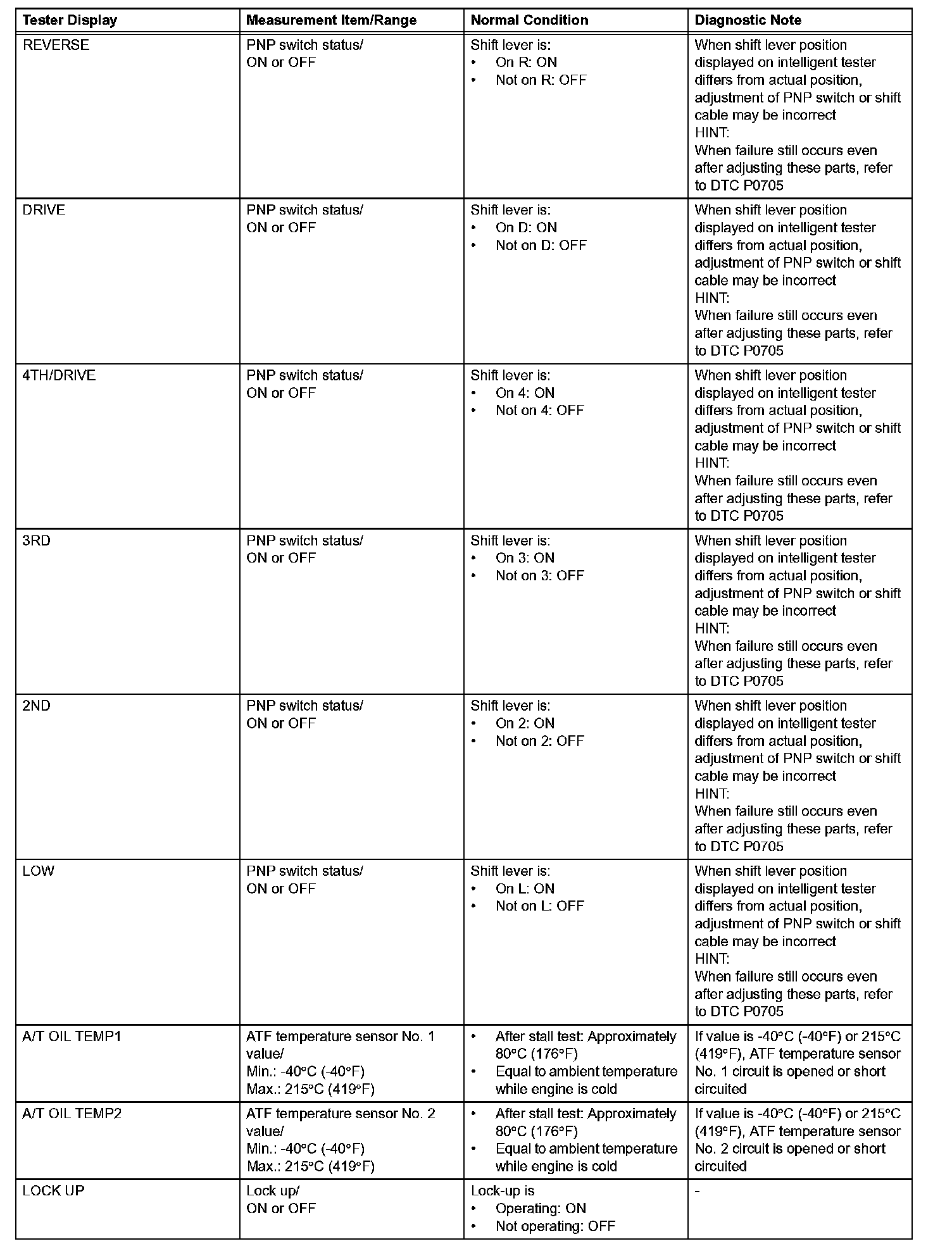 NOTICE: In the table, the values listed under "Normal Condition" are reference values. Do not depend solely on these reference values when deciding whether a part is faulty or not.