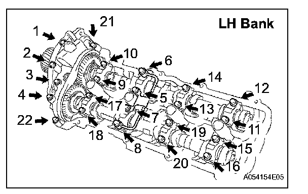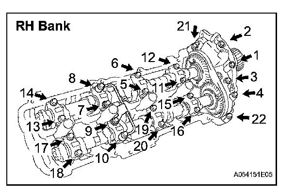 Uniformly tighten the 22 bearing cap bolts in several steps, in the order shown in the illustration.