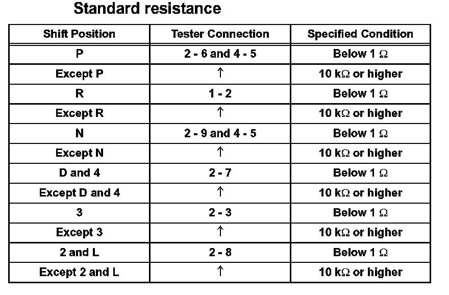 (c) Measure resistance according to the value(s) in the table when the shift lever is moved to each position.