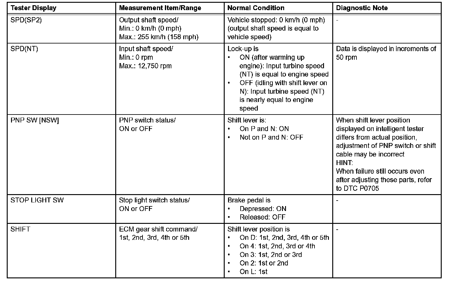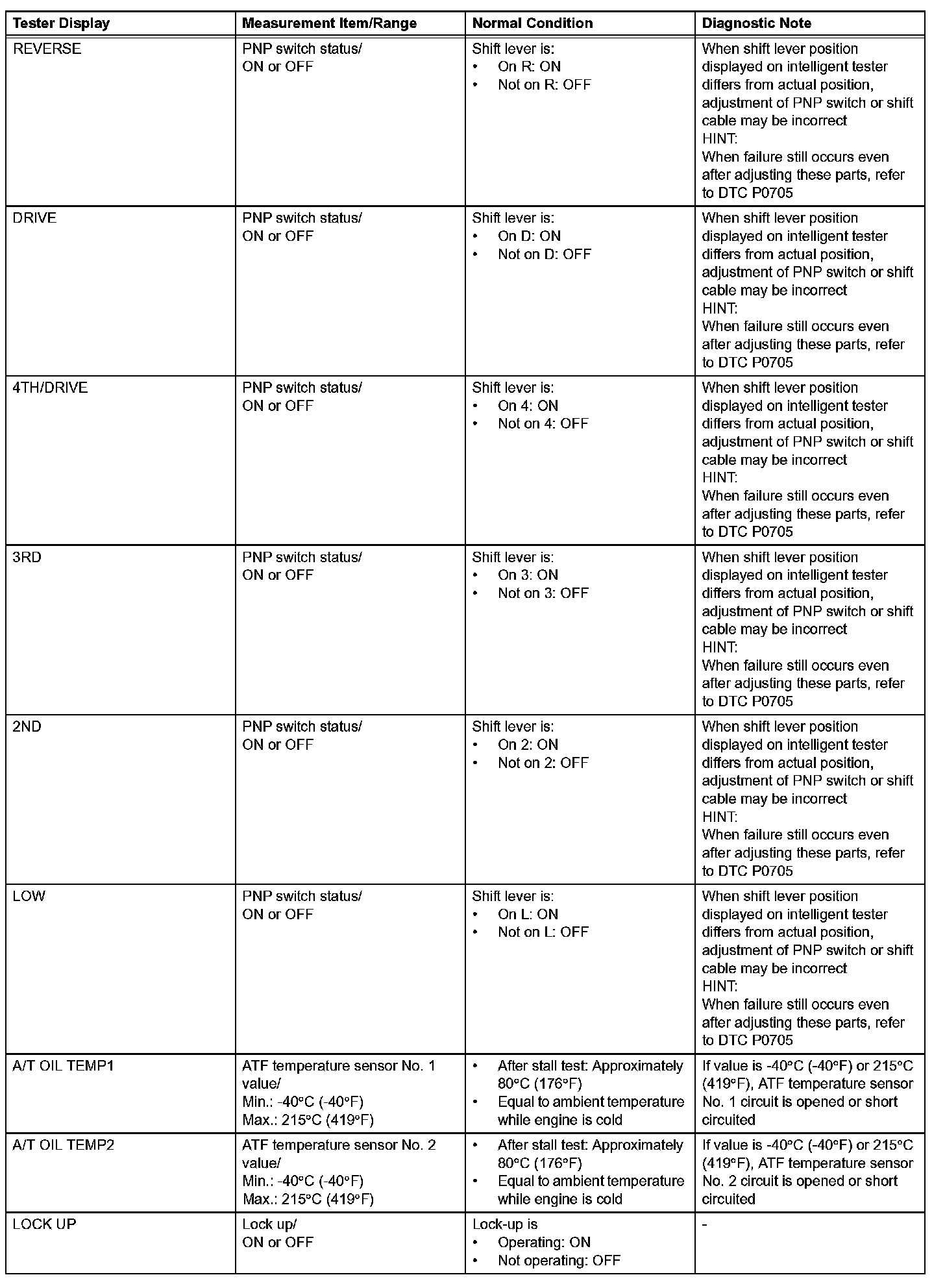 HINT: Using the intelligent tester DATA LIST allows switch, sensor, actuator and other item values to be read without removing any parts. Reading the Data List early in troubleshooting is one way to shorten labor time.