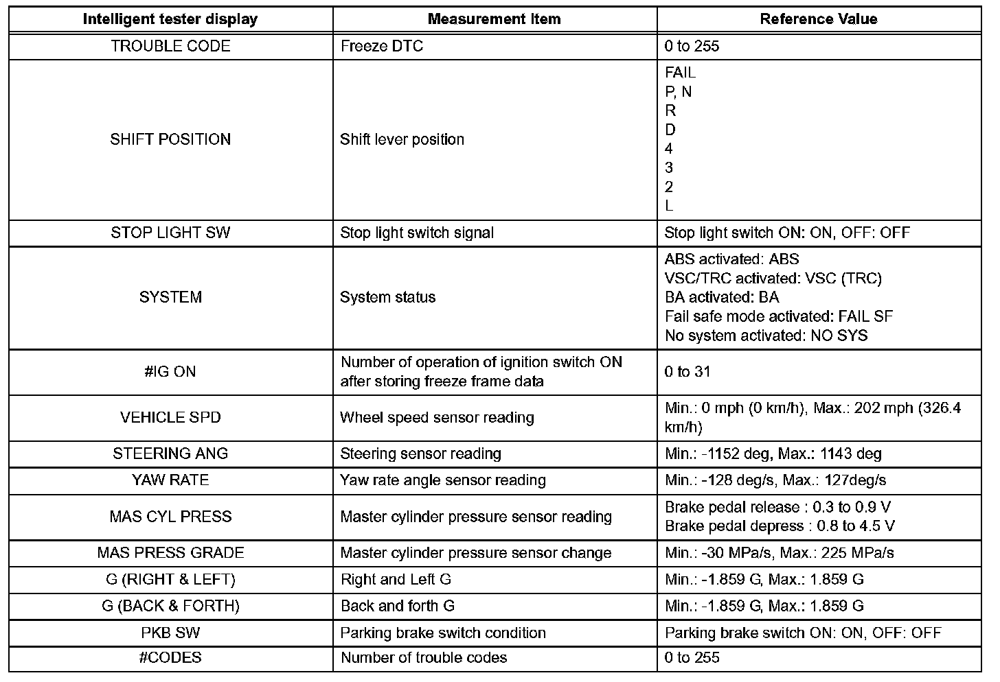 - Freeze frame data at the time the ABS operates: The skid control ECU stores and updates data whenever the ABS system operates.