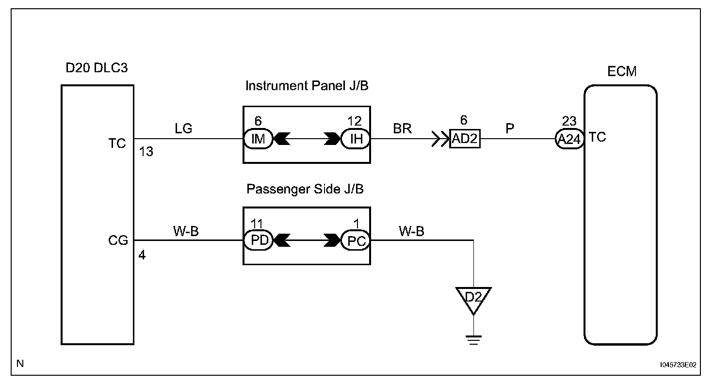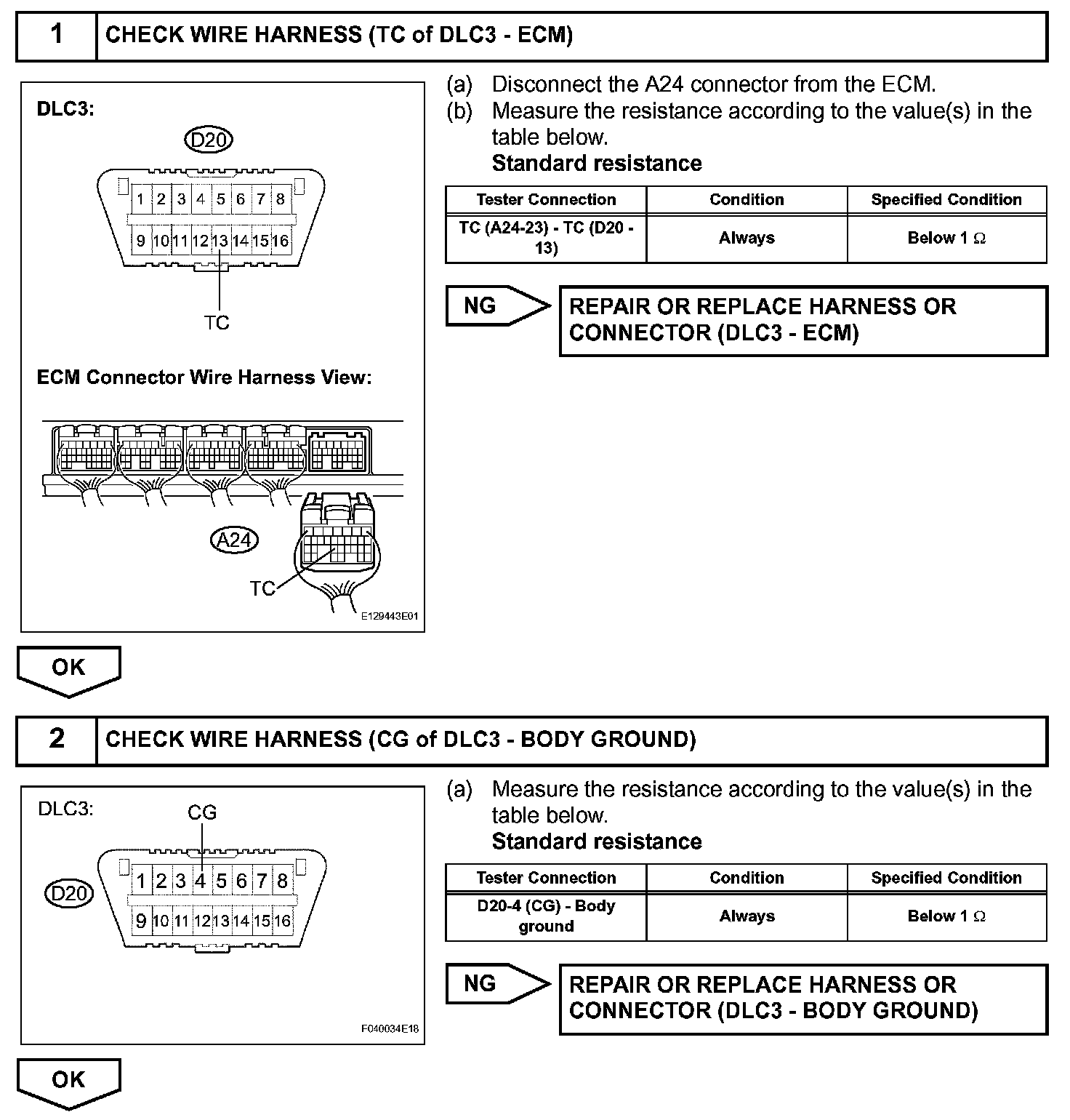 Connecting terminals TC and CG of the DLC3 causes the system to enter self-diagnostic mode. If a malfunction is present, DTCs will be output.