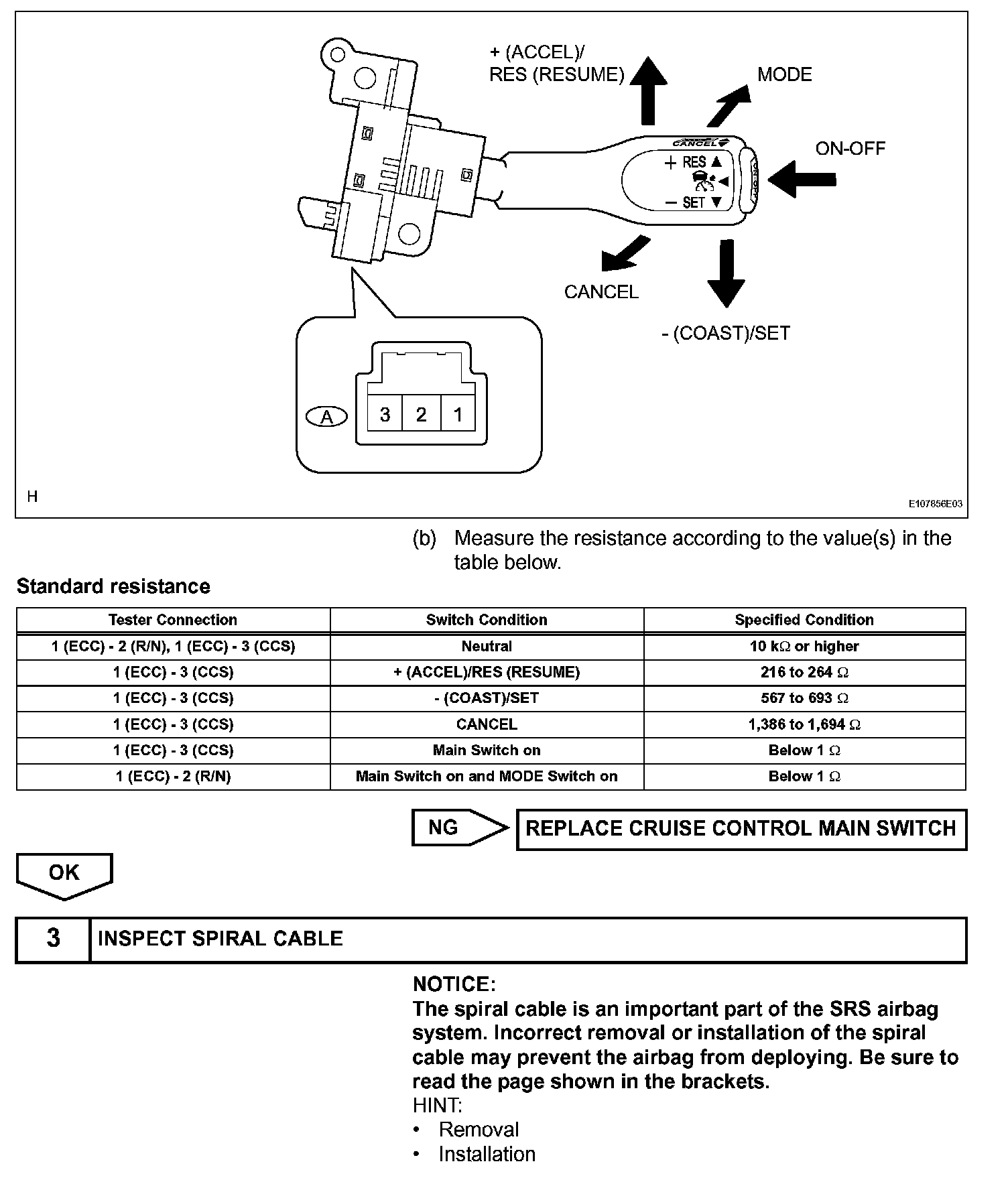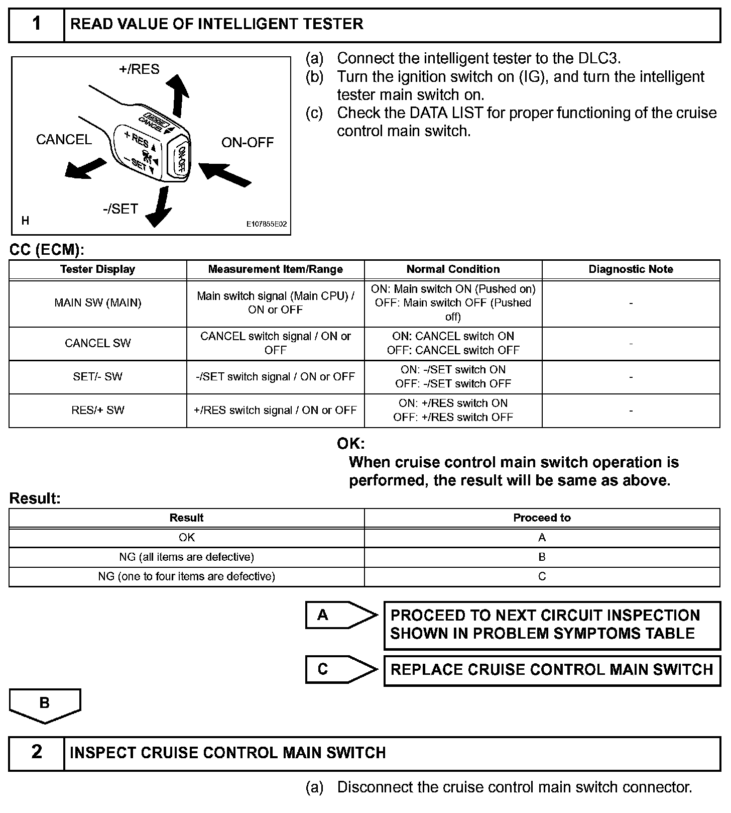 The cruise control main switch operates 8 functions: SET, COAST, TAP-DOWN, RESUME, ACCEL, TAP-UP, CANCEL and MODE. The SET, TAP-DOWN and COAST functions, and the RESUME, TAP-UP and ACCEL functions are operated with the same switch. The cruise control main switch is an automatic return type switch which turns on only while operating it in each arrow direction and turns off after releasing it. The internal contact point of the cruise control main switch is turned on with the switch operation. The hybrid vehicle control ECU then reads the resistance value that has been changed by the switch operation to control MODE, SET, COAST, RESUME, ACCEL and CANCEL. The dynamic radar cruise control system has two cruise control modes: the constant speed control mode and vehicle-to-vehicle distance control mode.