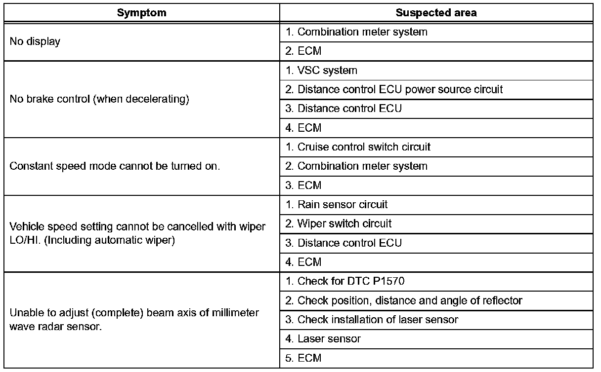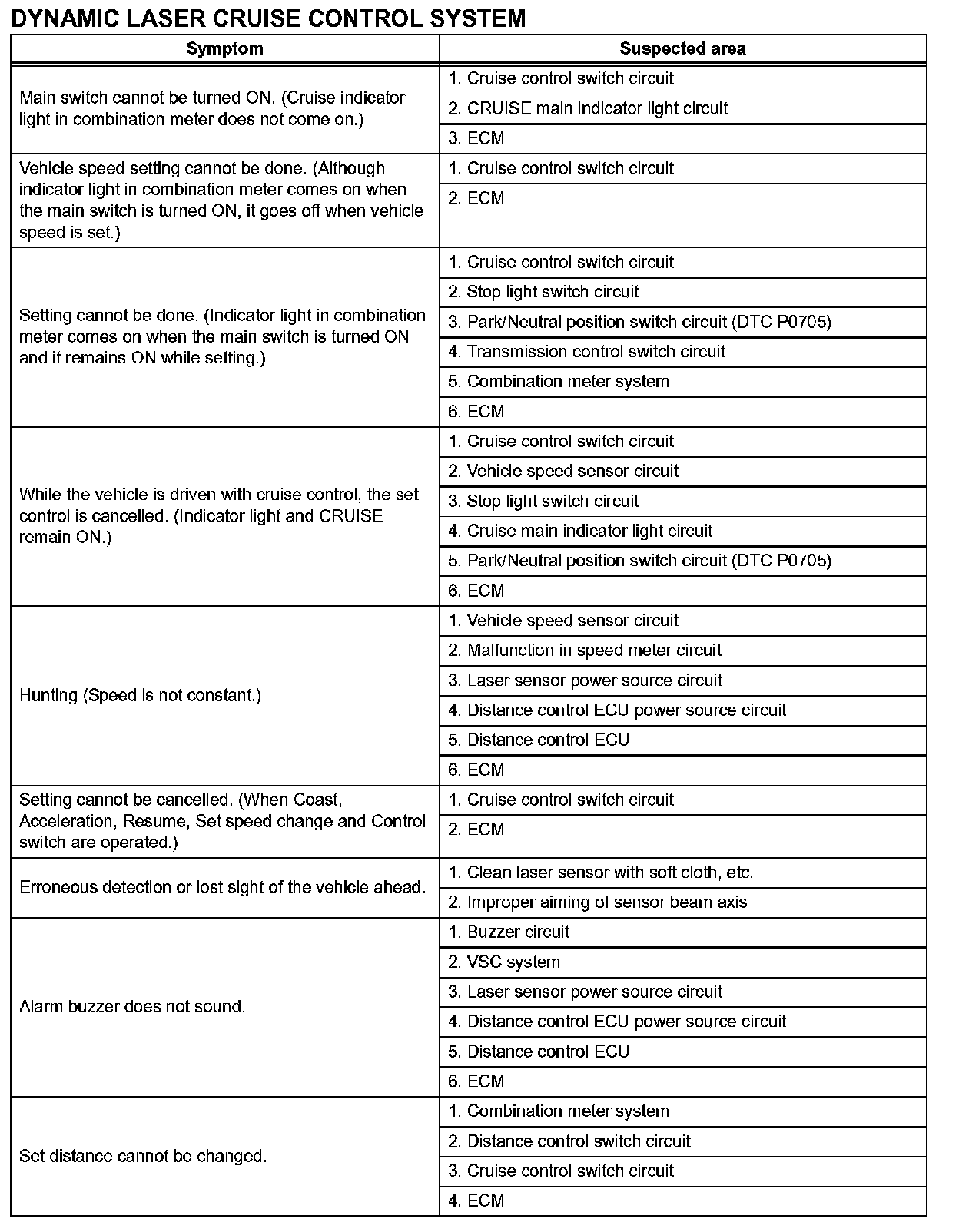 PROBLEM SYMPTOMS TABLEIf a normal system code is displayed during the DTC check but the problem still occurs, check the suspected areas for each problem symptom in the order given in the table and proceed to the relevant troubleshooting.