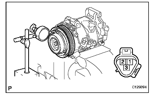b. Connect the battery positive lead to terminal 3 of the magnetic clutch connector and the negative lead to the earth wire. Turn on and off the magnetic clutch and measure the clearance.