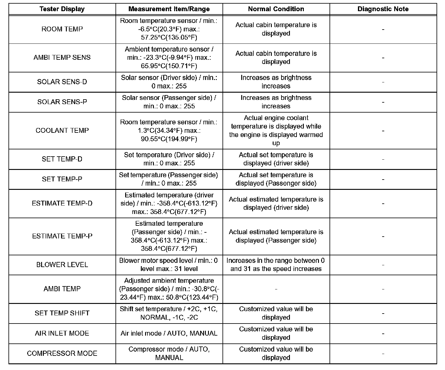 DATA LISTHINT: Using the intelligent tester to read the Data List allows the values or states of switches, sensors, actuators and other items to be read without removing any parts. This non-intrusive inspection can be very useful because intermittent conditions or signals may be discovered before parts or writing is disturbed. Reading the Data List information early in troubleshooting is one way to save diagnostic time.