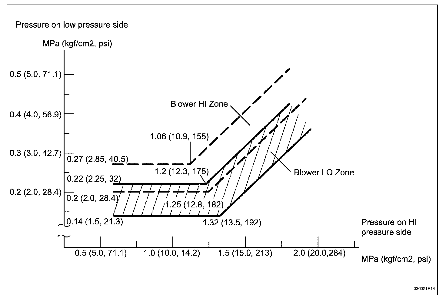 High pressure side:1.37 to 1.57 MPa (14 to 16 kgf/sq.cm, 199 to 228 psi)