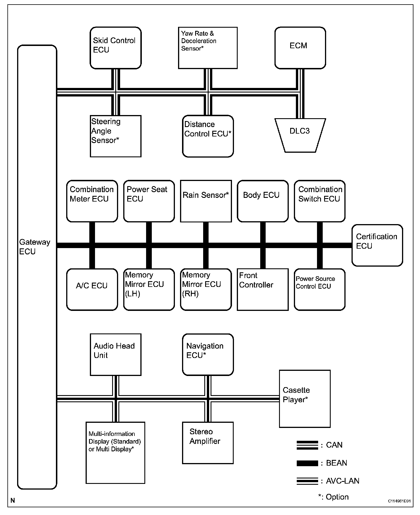 2. A single, Automobile Vinyl (AV) wire is used for BEAN communication. A twisted-pair wire is used for CAN and AVC-LAN communication.