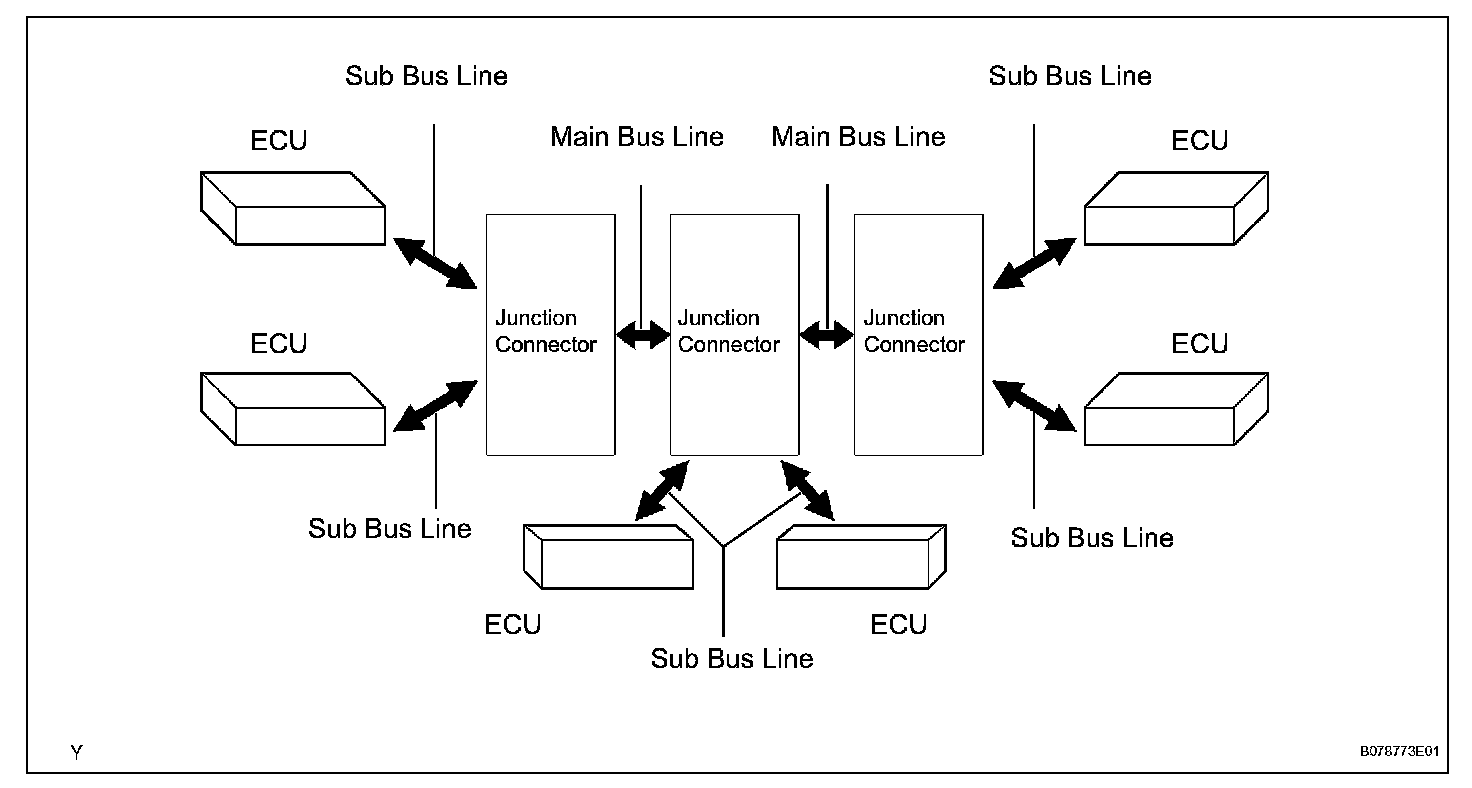 1. The CAN uses a multi star style bus connection. The 3 junction connectors are connected by a main bus line. Junction connectors communicate with ECUs using a sub bus line.