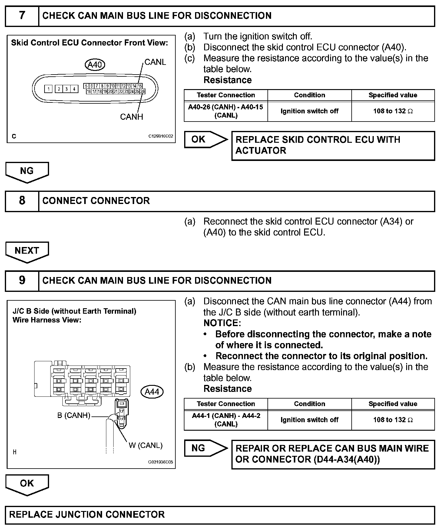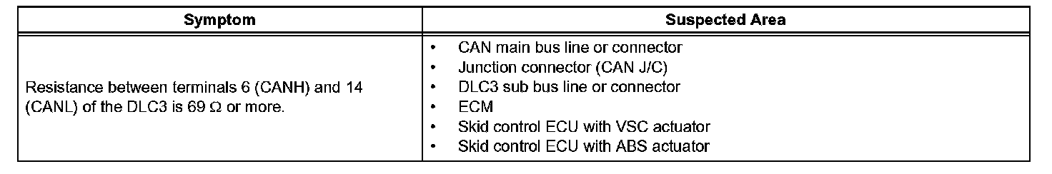 There may be an open circuit in the CAN main bus line and/or the DLC3 sub bus line when the resistance between terminals 6 (CANH) and 14 (CANL) of the DLC3 is 69 ohms or more.