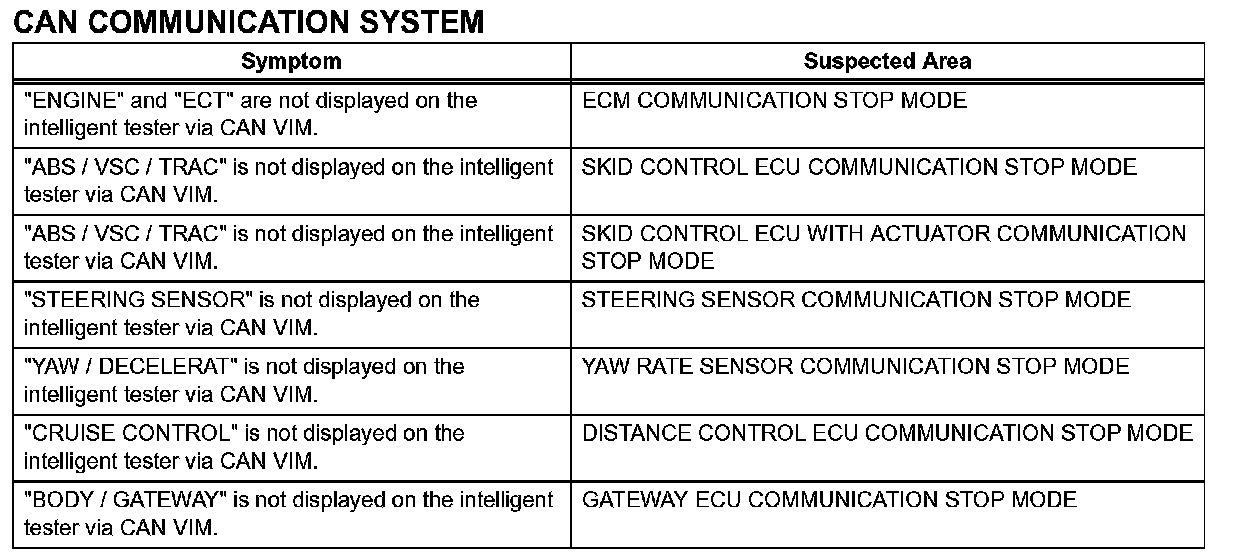 - If 2 or more ECUs or sensors are not displayed on the intelligent tester via the CAN VIM, perform troubleshooting for communication stop mode for each undisplayed ECU or sensor. (Either side of the CAN bus lines may be open.)
