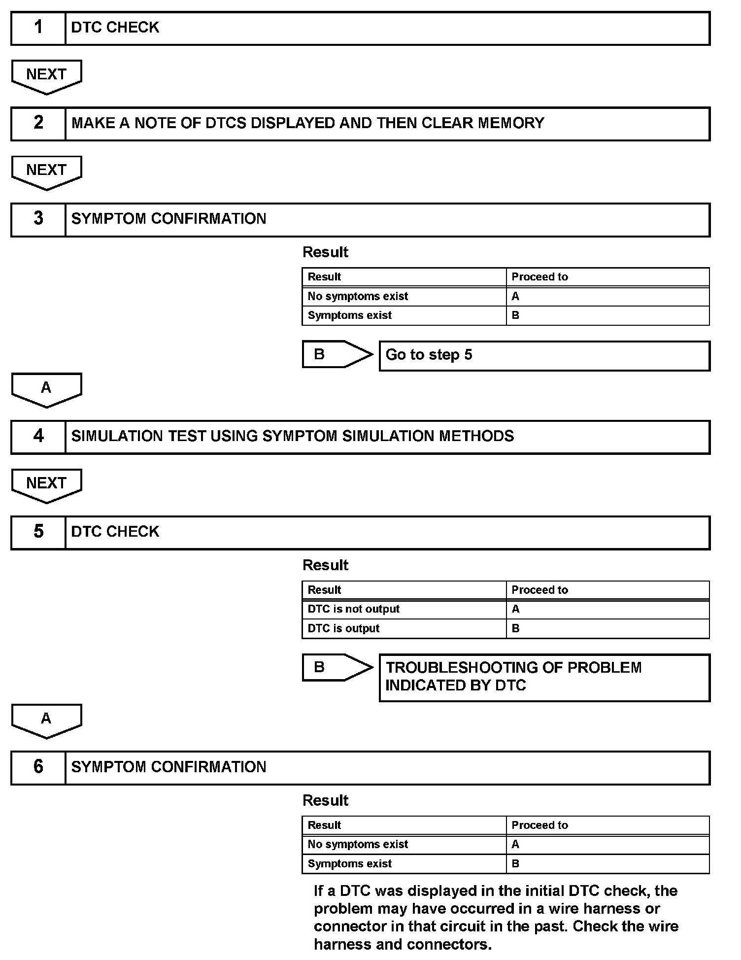 - In the DTC check, it is very important to determine whether the problem indicated by the DTC either: 1) still occurs, or 2) occurred in the past but has returned to normal. In addition, the DTC should be compared to the problem symptom to see if they are related. For this reason, DTCs should be checked before and after confirmation of symptoms (i.e., whether or not problem symptoms exist) to determine current system conditions, as shown in the flowchart below.