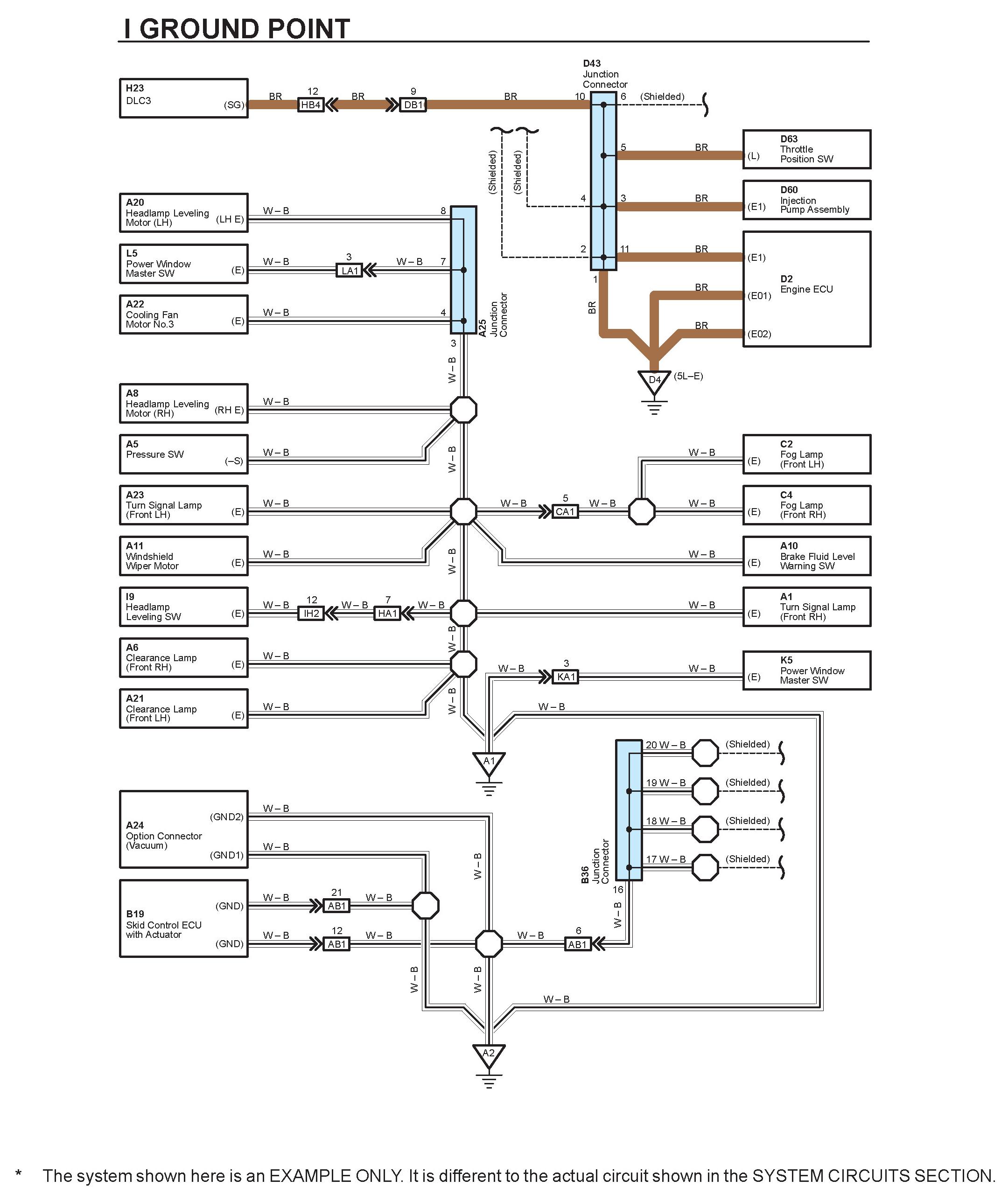 HOW TO READ GROUND POINTSThe ground points circuit diagram shows the connections from all major parts to the respective ground points. When troubleshooting a faulty ground point, checking the system circuits which use a common ground may help you identify the problem ground quickly. The relationship between ground points (A1, A2 and D4 shown) can also be checked this way.