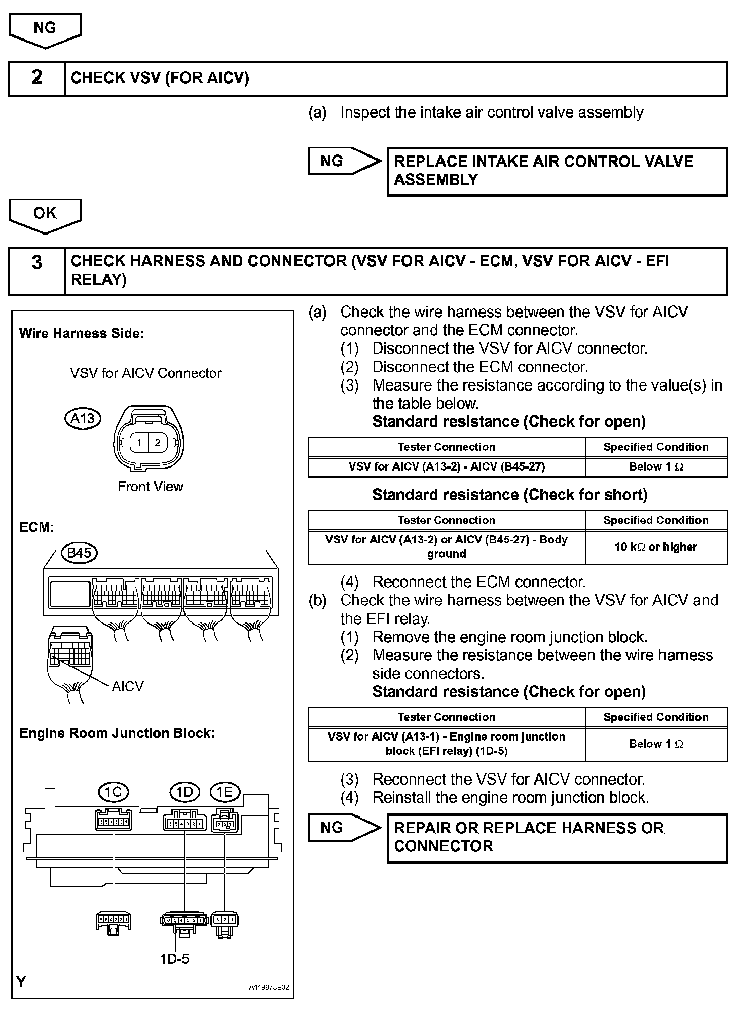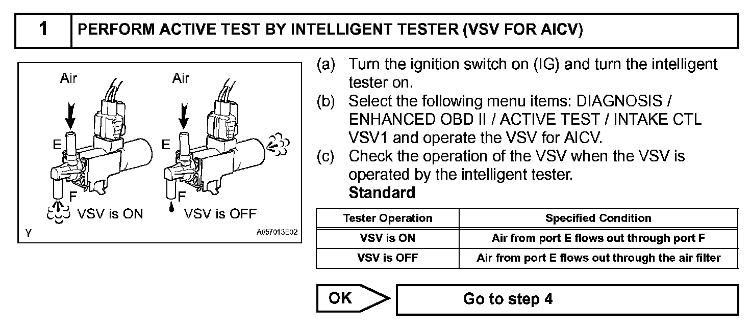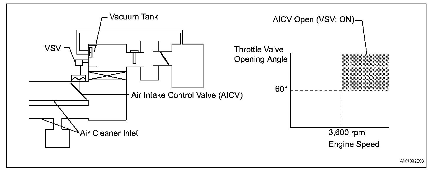 When the engine is operating in the low-to-mid speed range, this control operates the AICV to close one of the air cleaner inlets. When the engine speed is more than 3,600 rpm and the opening angle of the throttle valve is more than 60°, the ECM activates the VSV and opens the AICV.