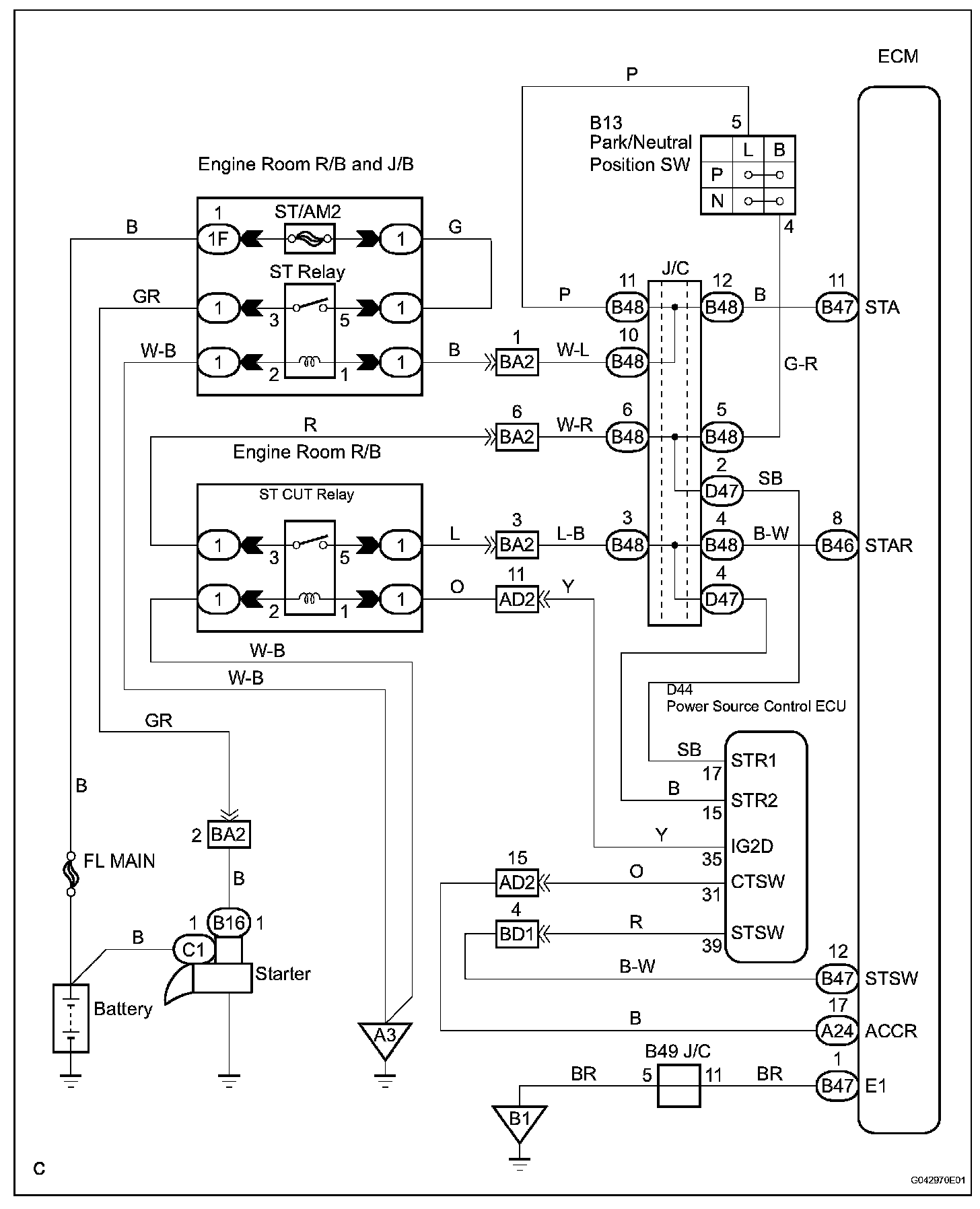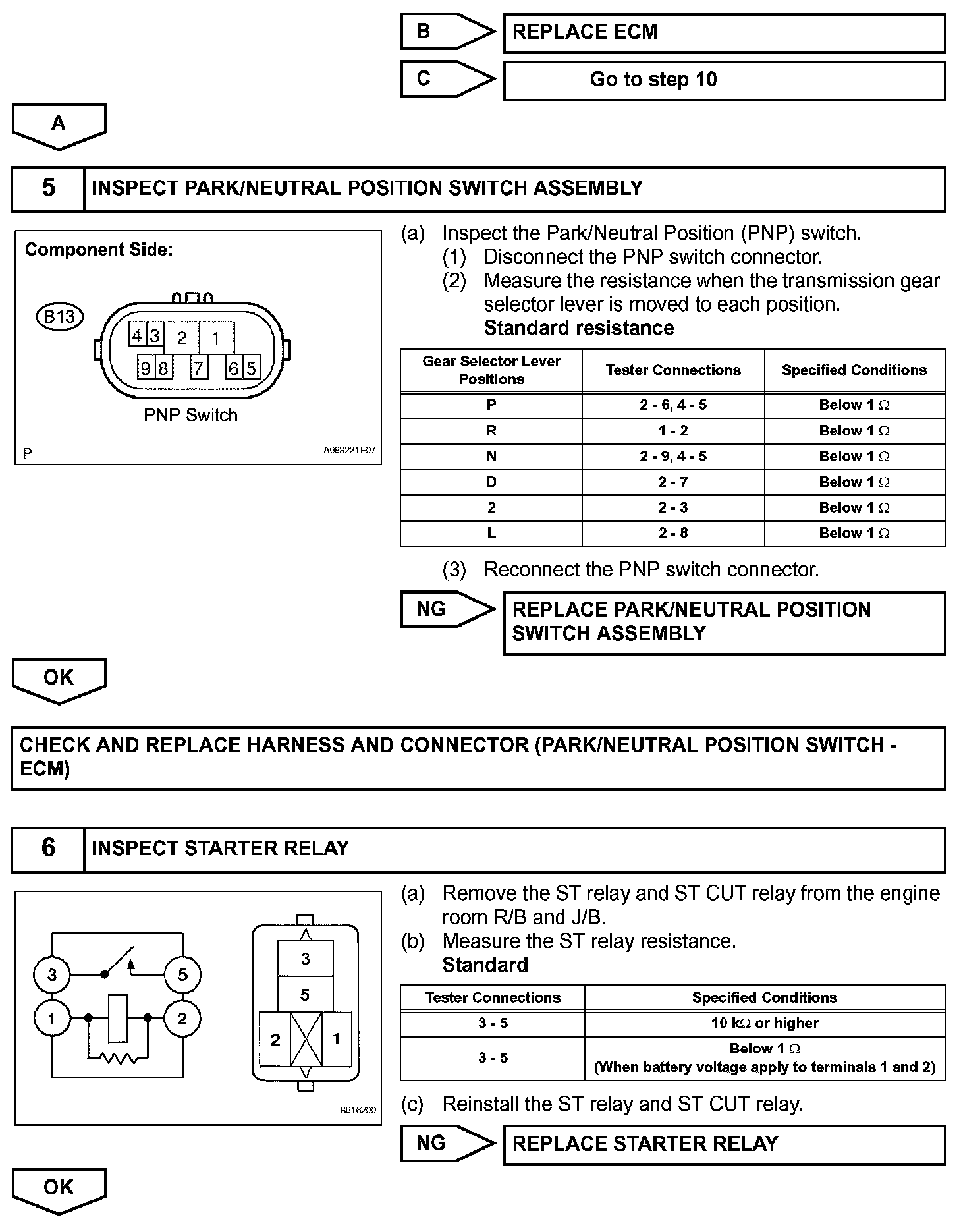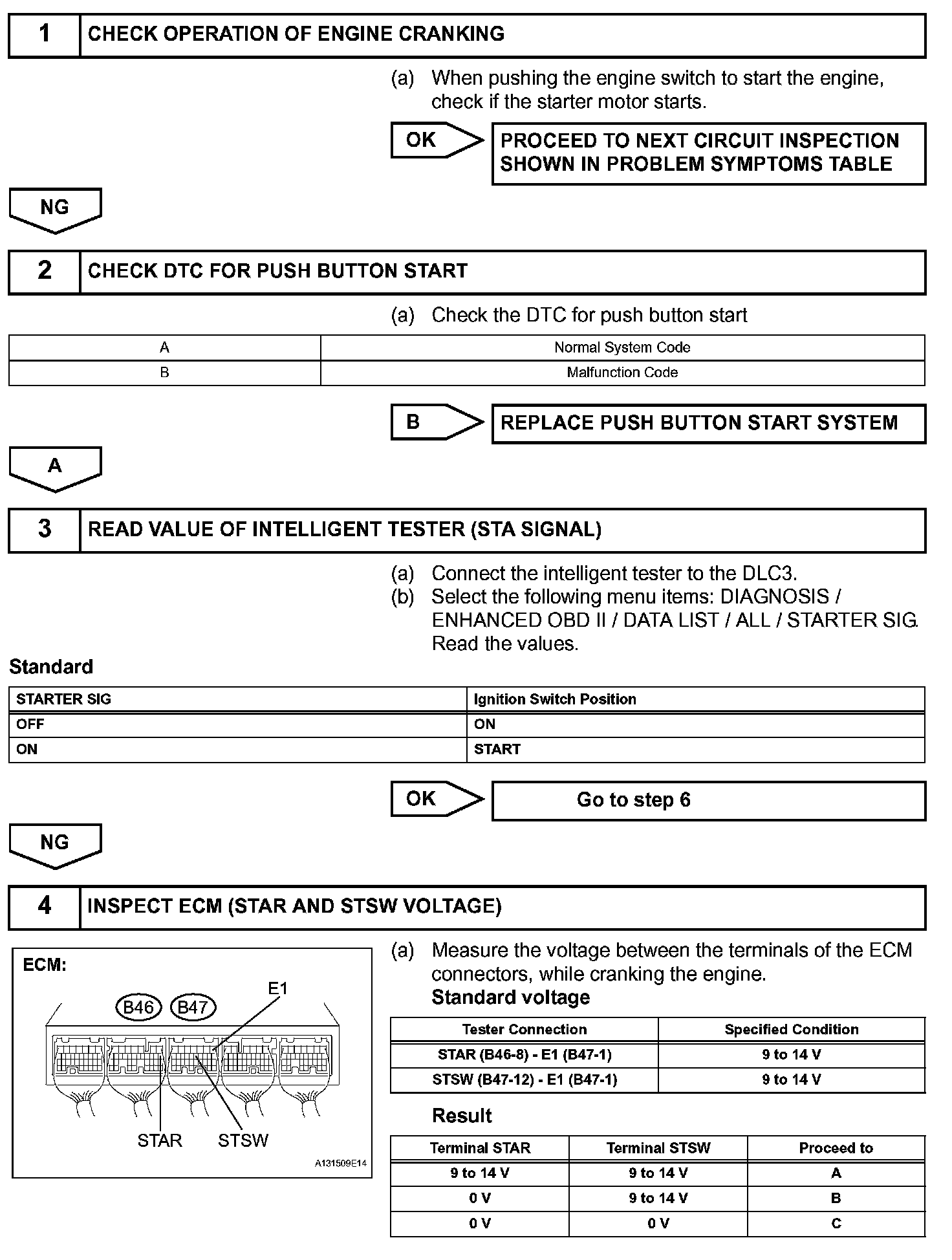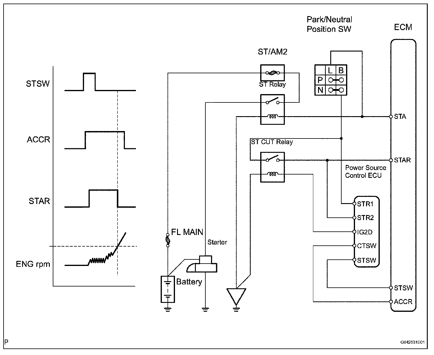When the ECM detects a start signal from the engine switch, this system monitors the engine rpm and continues to operate the starter until it has determined that the engine has started (engine speed reaches approximately 500 rpm). Furthermore, even if the ECM detects a start signal from the ignition switch, it will not operate the starter if it has determined that the engine has already started.