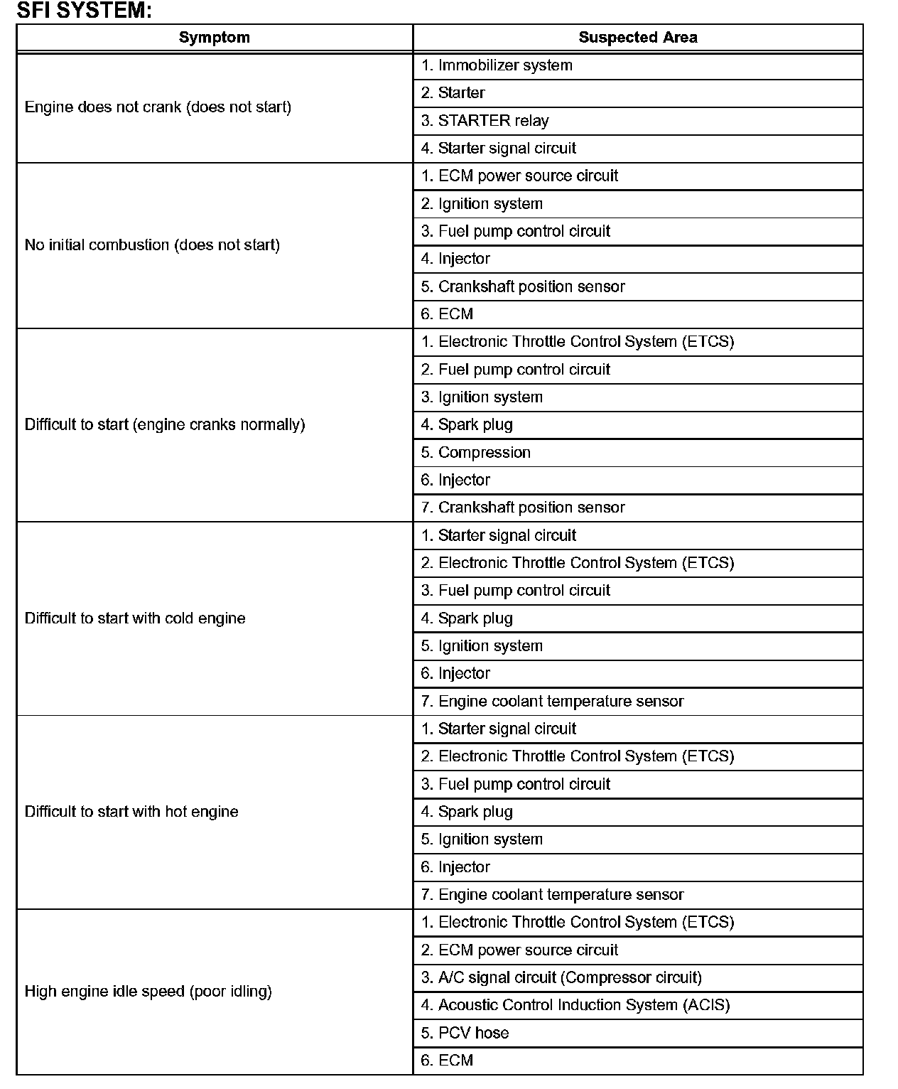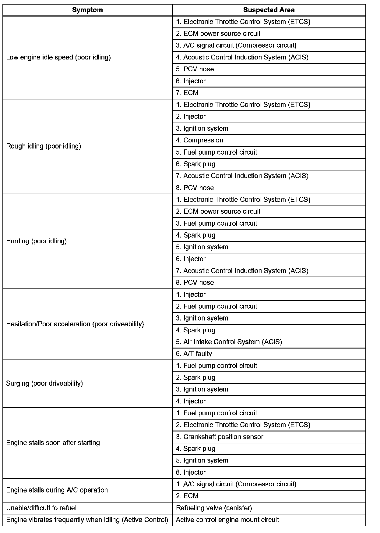 HINT: When a malfunction is not confirmed by a DTC (Diagnostic Trouble Code) check and the cause of problem cannot be identified through a basic inspection, troubleshoot according to the priority order indicated in the table.
