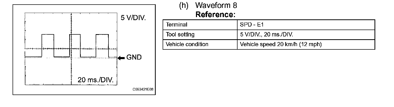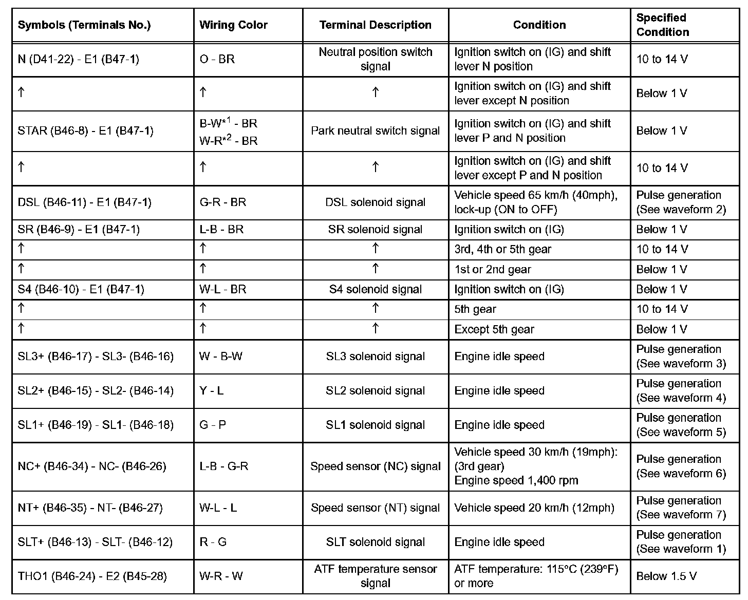 In the table, first follow the information under "Condition". Look under "Symbols (Terminal No.)" for the terminals to inspected. The standard voltage between the terminals is shown under "Specific Condition".