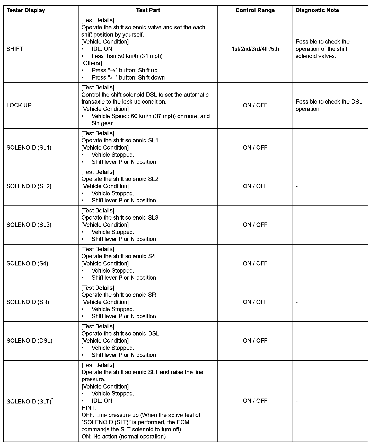 "SOLENOID (SLT) in the ACTIVE TEST is performed to check the line pressure changes by connecting the SST to the automatic transaxle, which is used in the HYDRAULIC TEST as well. Hydraulic Test