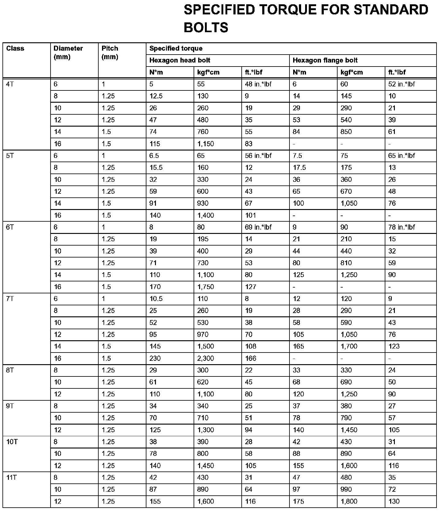 Standard Bolt - Specified Torque For Standard Bolts: