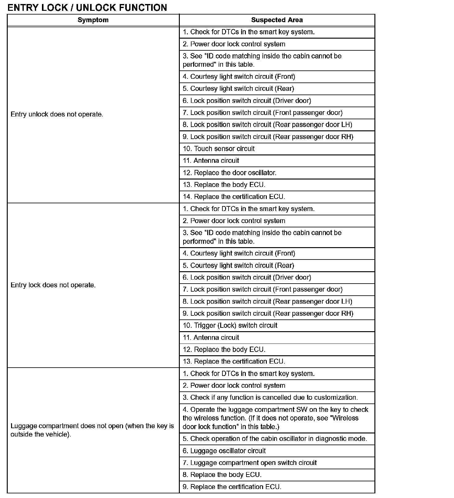 Problem Symptoms Table-Entry Lock/Unlock Function (Part 1):