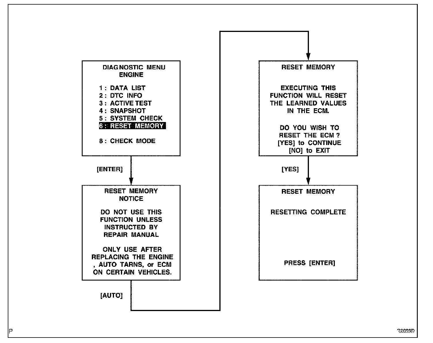 The ECM memorizes the condition that the ECT controls the automatic transaxle assembly and engine assembly according to those characteristics. Therefore, when the automatic transaxle assembly, engine assembly, or ECM has been replaced, it is necessary to reset the memory so that the ECM can memorize the new information.