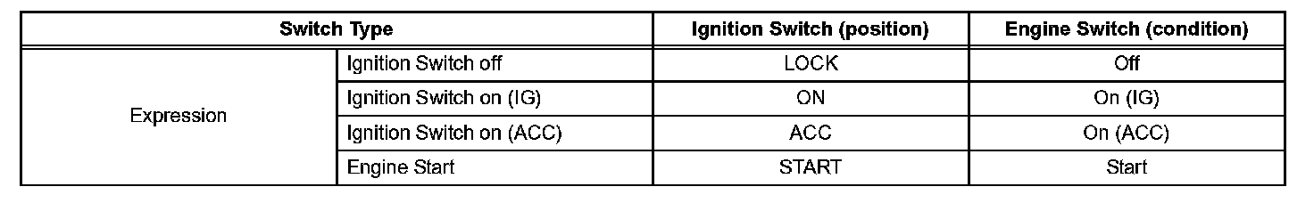 The type of ignition switch used on this model differs according to the specifications of the vehicle. The expressions listed in the table below are used.