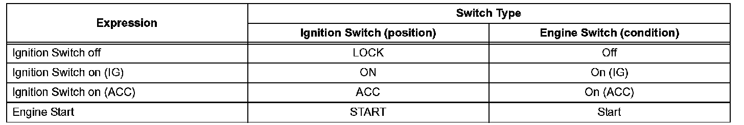 The type of ignition switch used on this model differs according to the specifications of the vehicle. The expressions listed in the table below are used.
