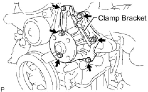 Install the water pump and clamp bracket with the 4 bolts and 2 nuts.