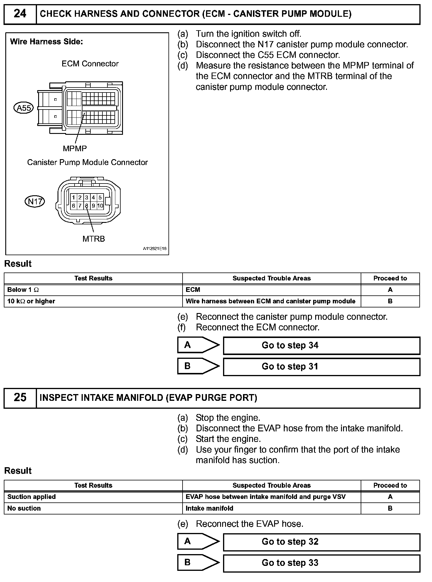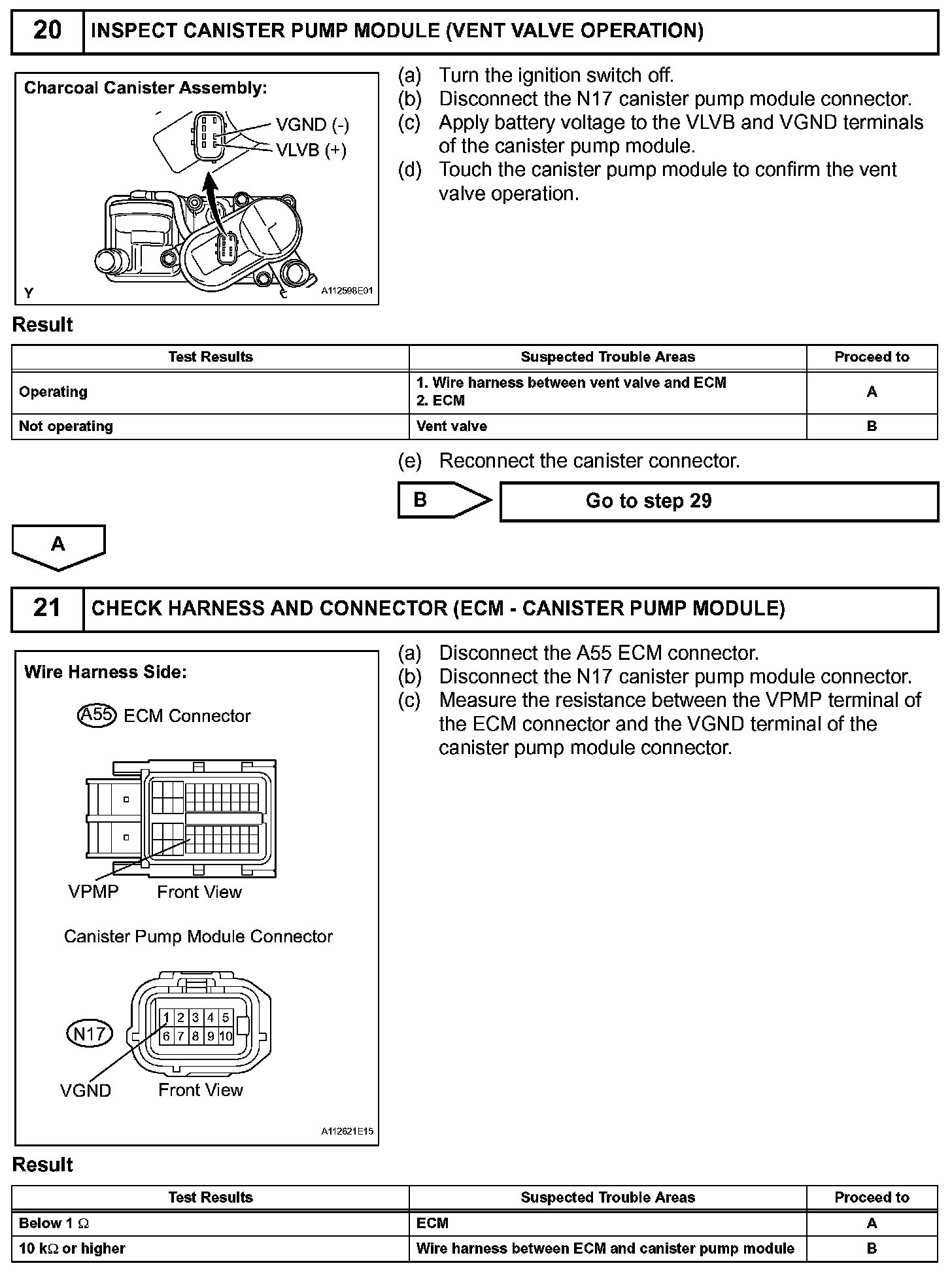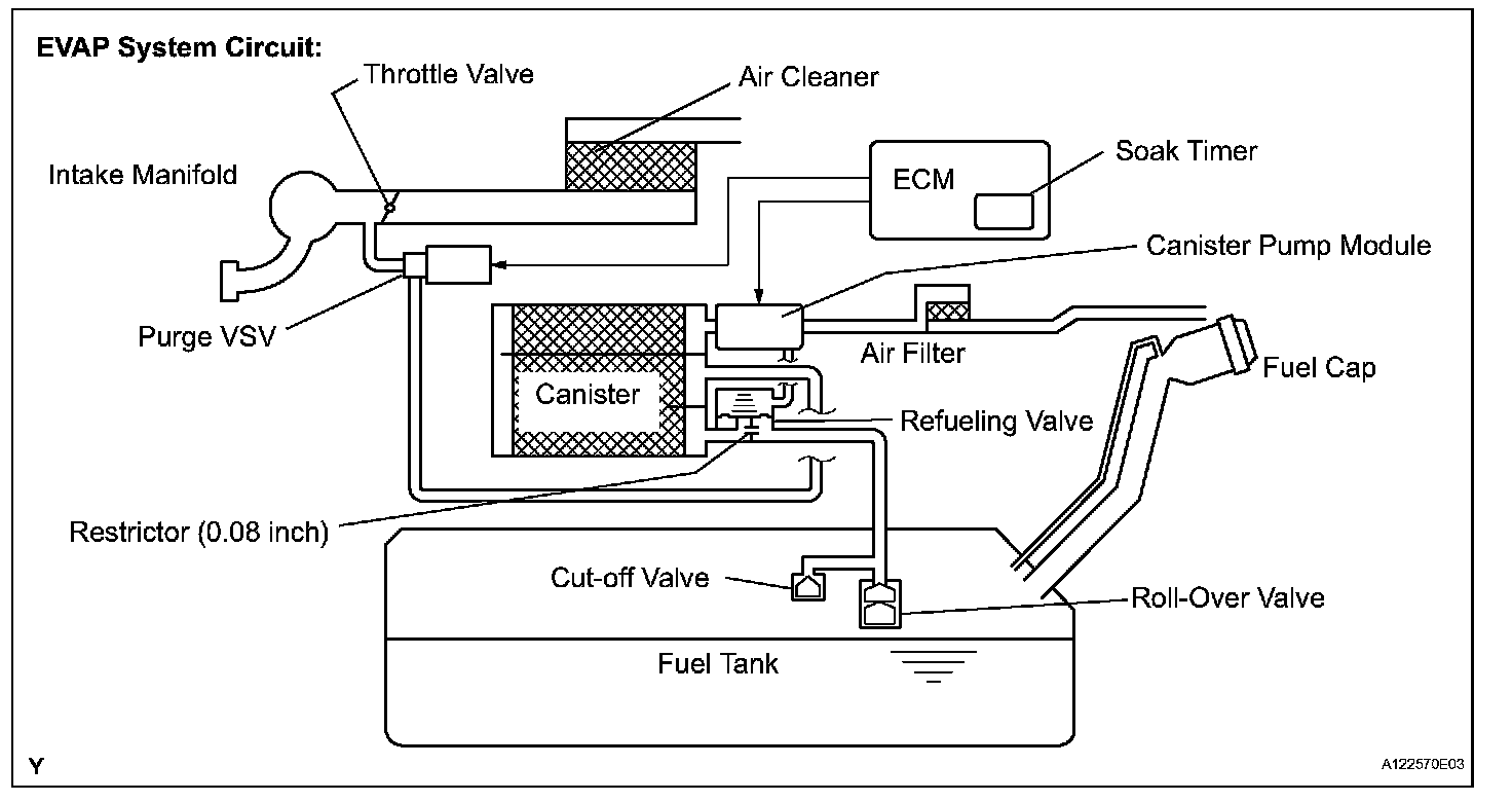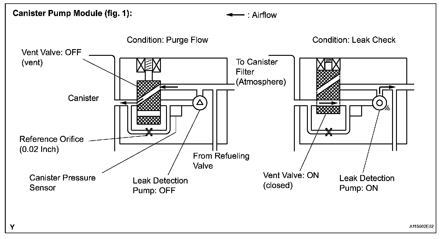 The leak detection pump creates negative pressure (vacuum) in the EVAP system and the pressure is measured. Finally, the ECM monitors for leaks from the EVAP system, and malfunctions in both the canister pump module and purge VSV, based on the EVAP pressure.