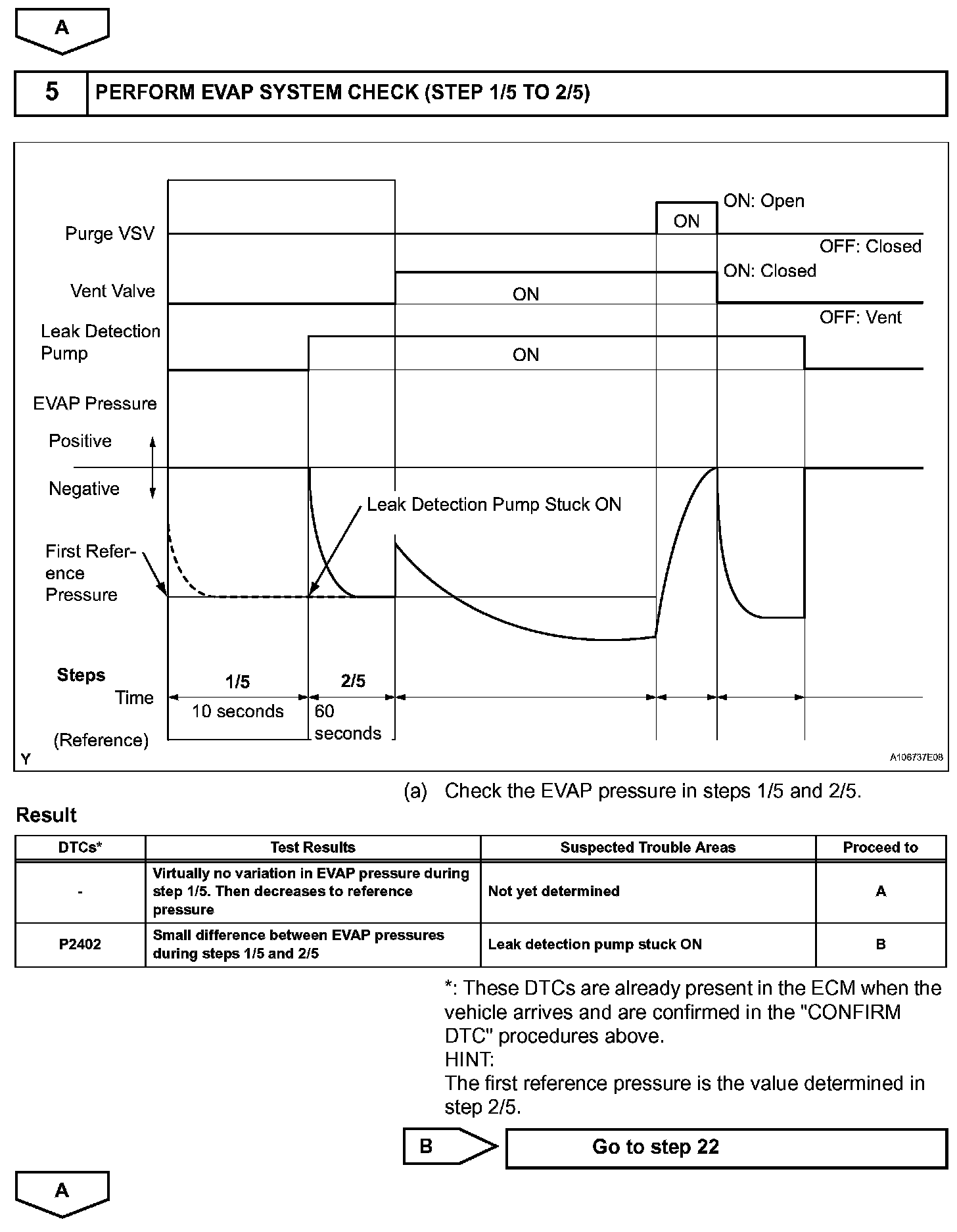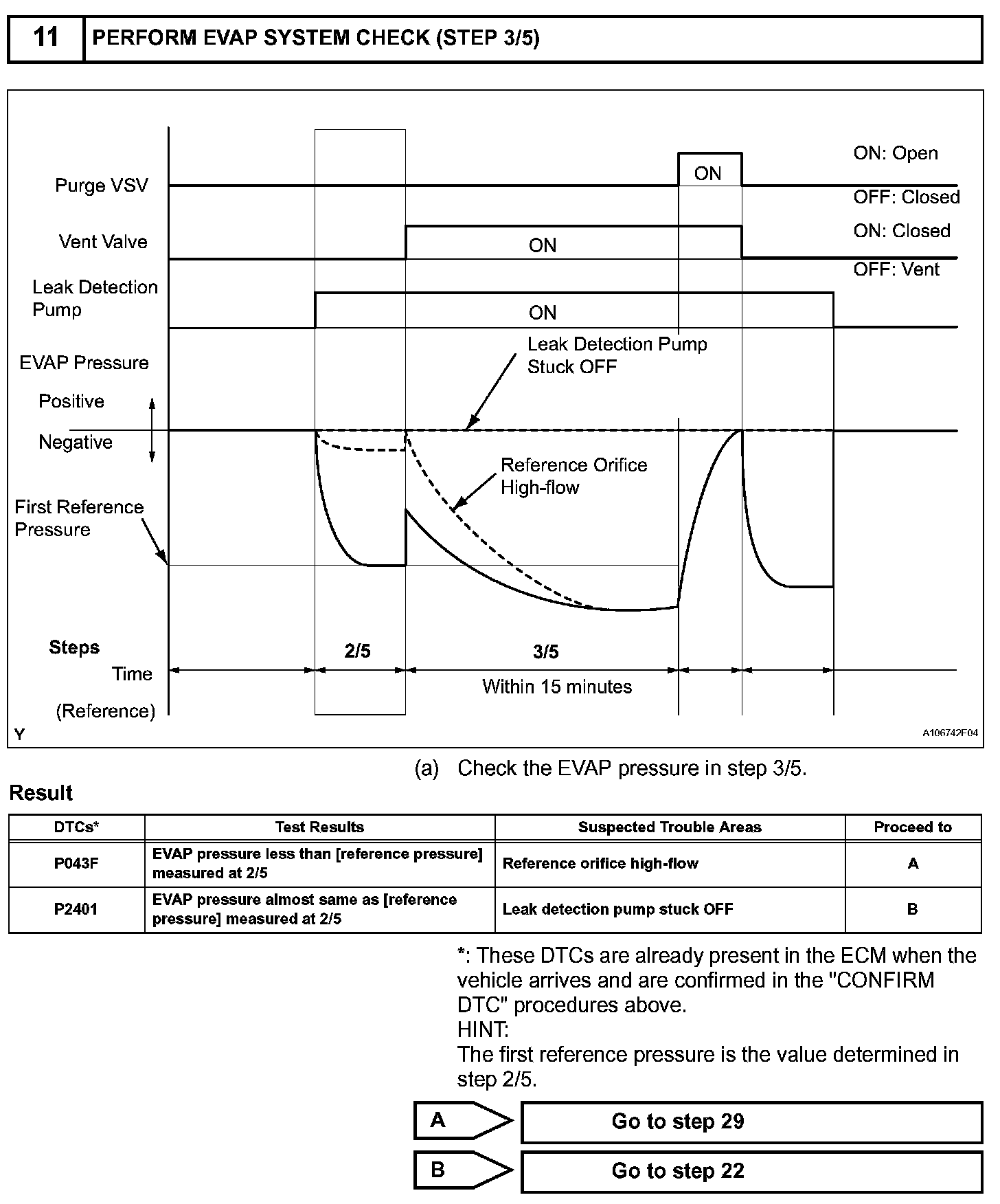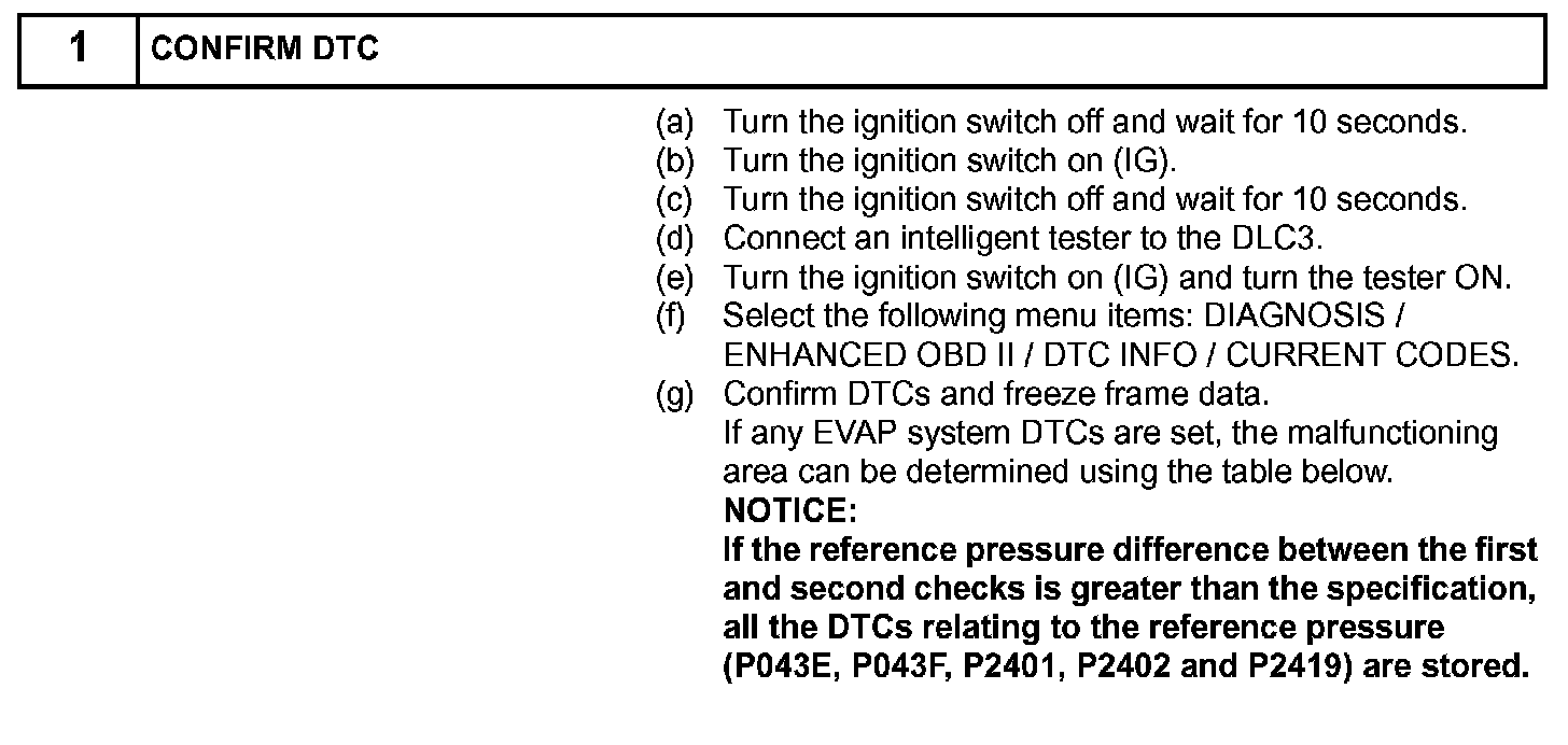 NOTE: If the reference pressure difference between the first and second checks is greater than the specification, all the DTCs relating to the reference pressure (P043E, P043F, P2401, P2402 and P2419) are stored.