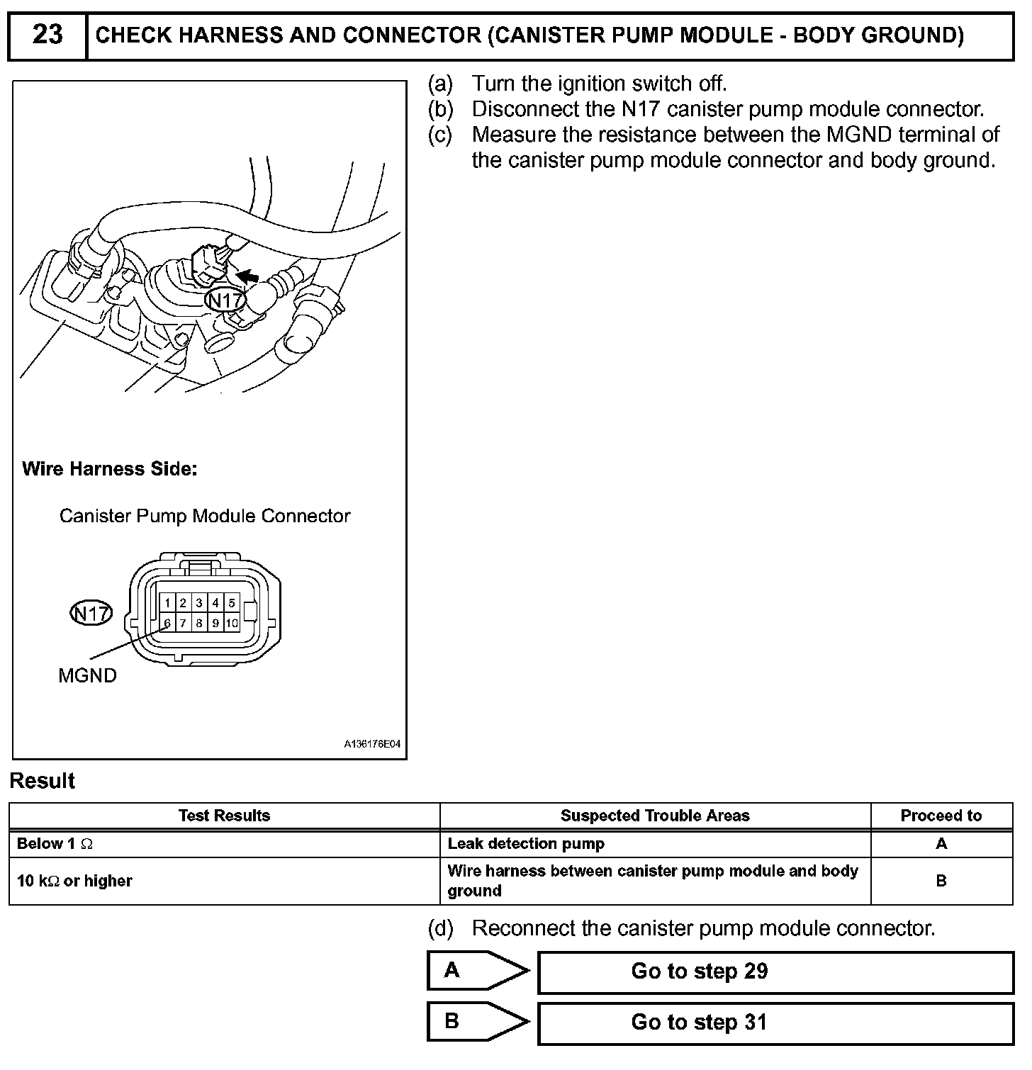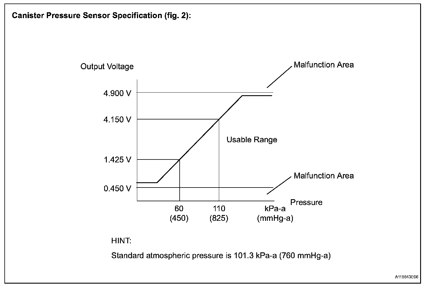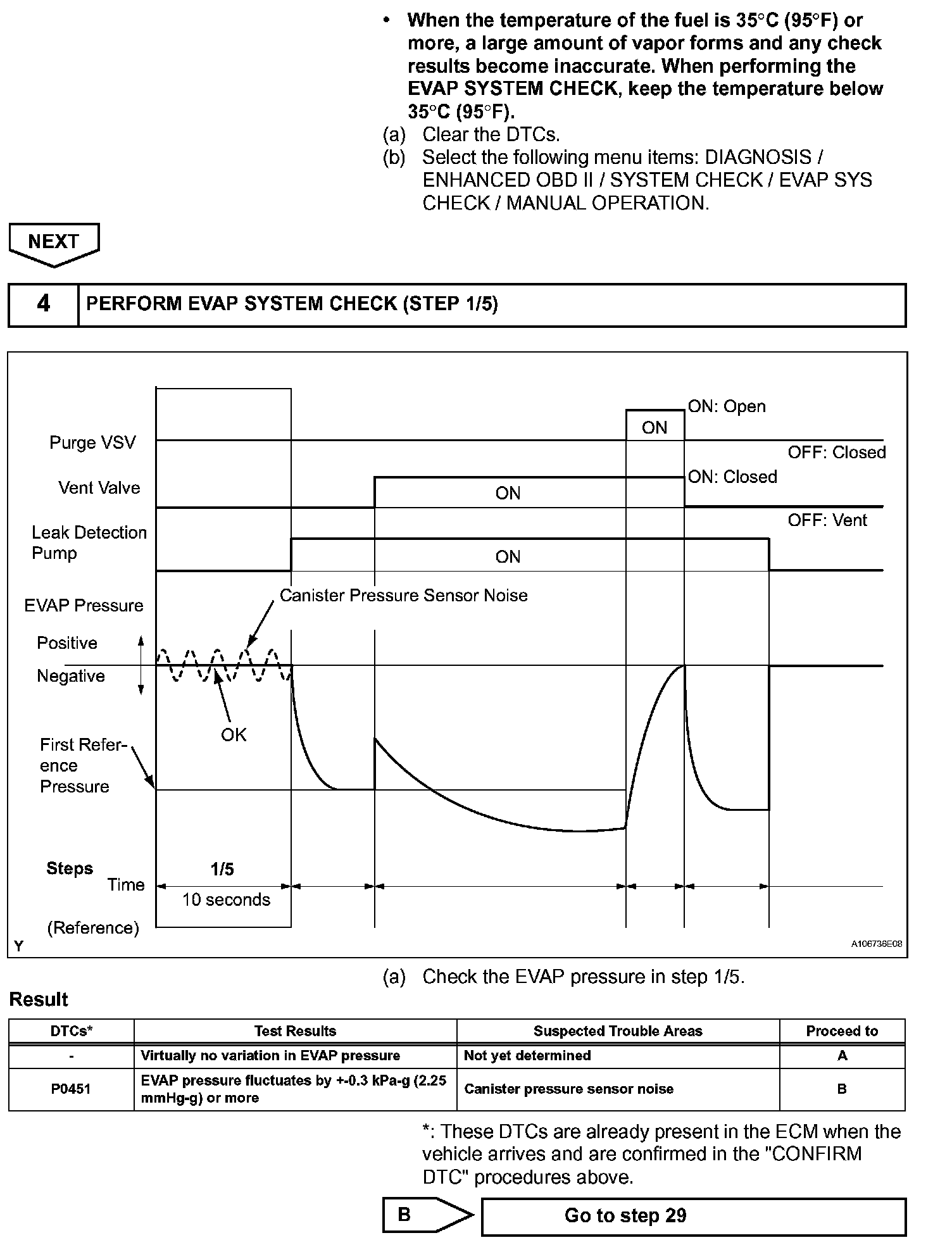 NOTE: If the reference pressure difference between the first and second checks is greater than the specification, all the DTCs relating to the reference pressure (P043E, P043F, P2401, P2402 and P2419) are stored.