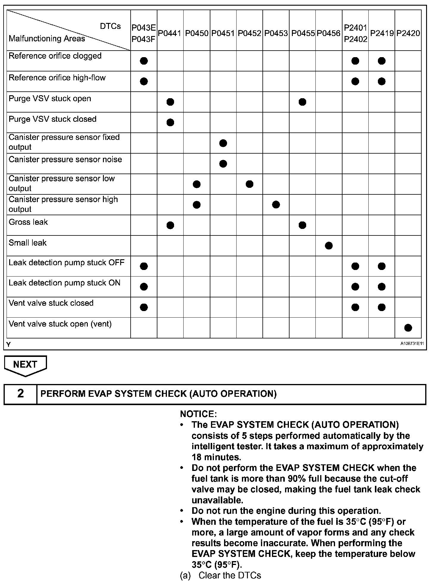 If any EVAP system DTCs are set, the malfunctioning area can be determined using the table given.