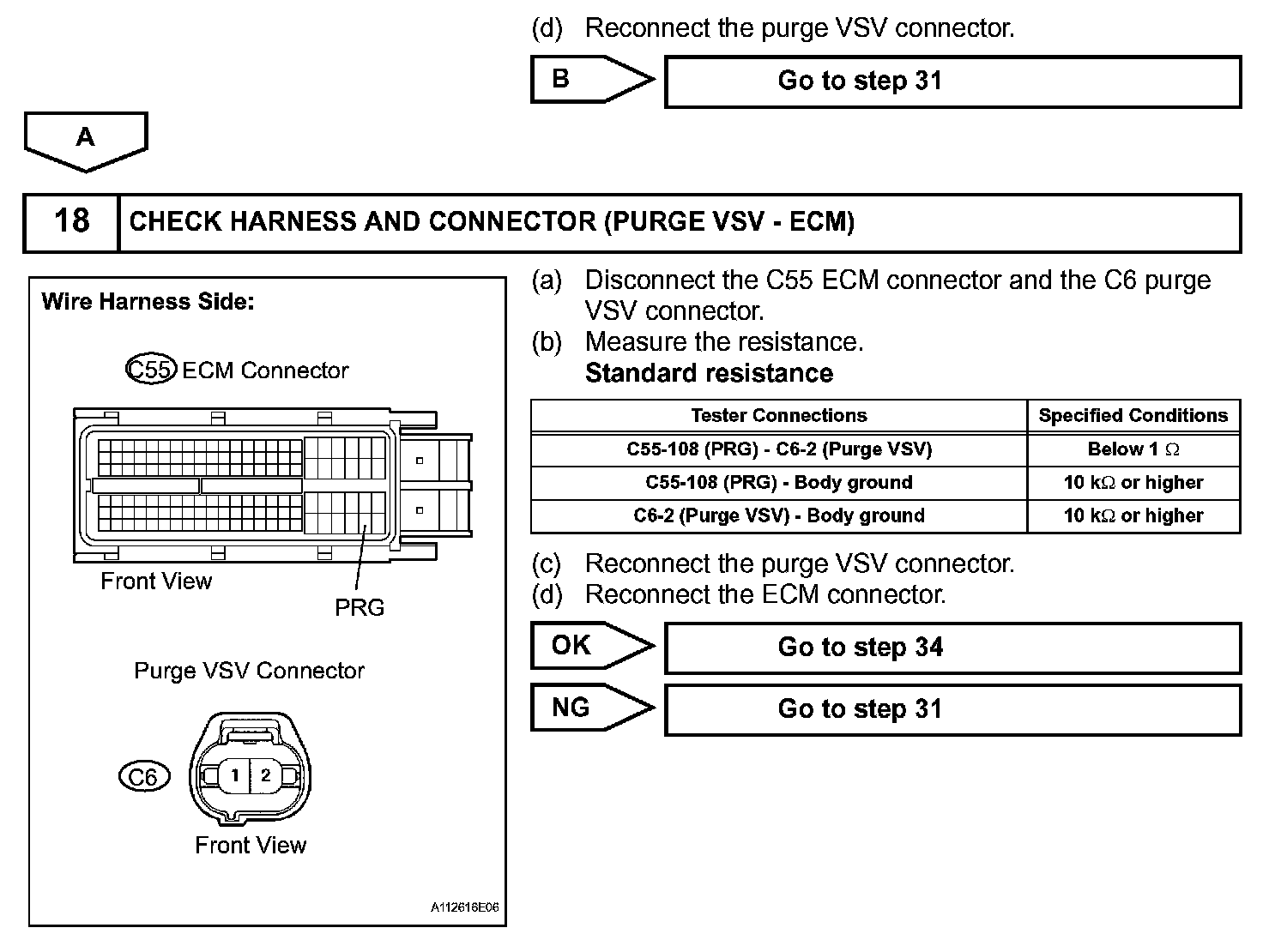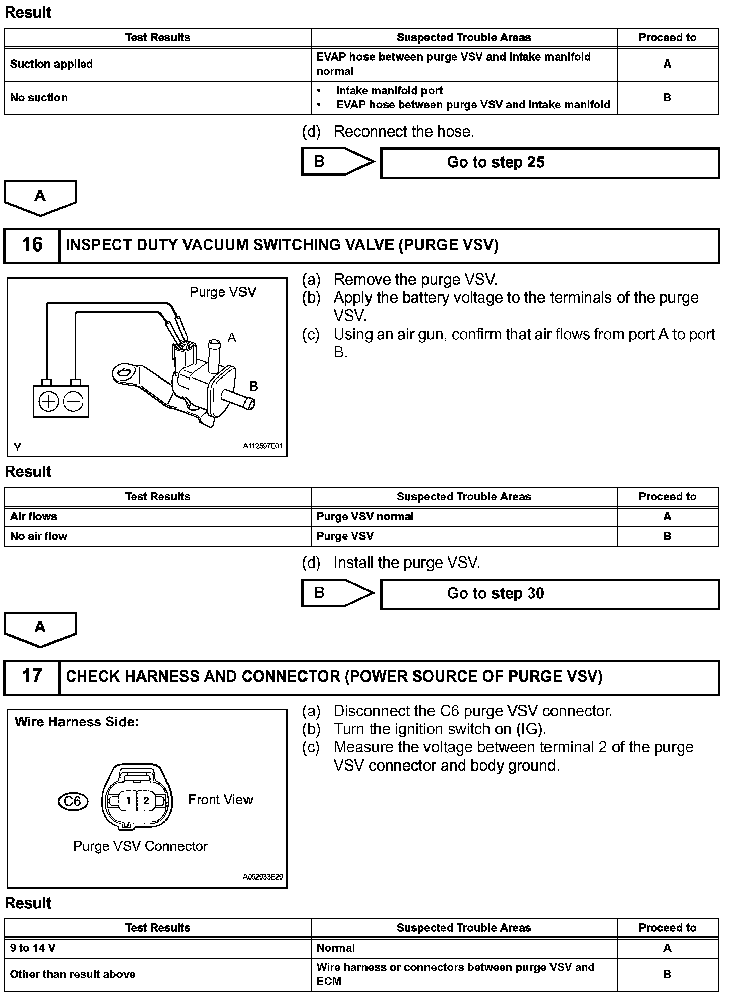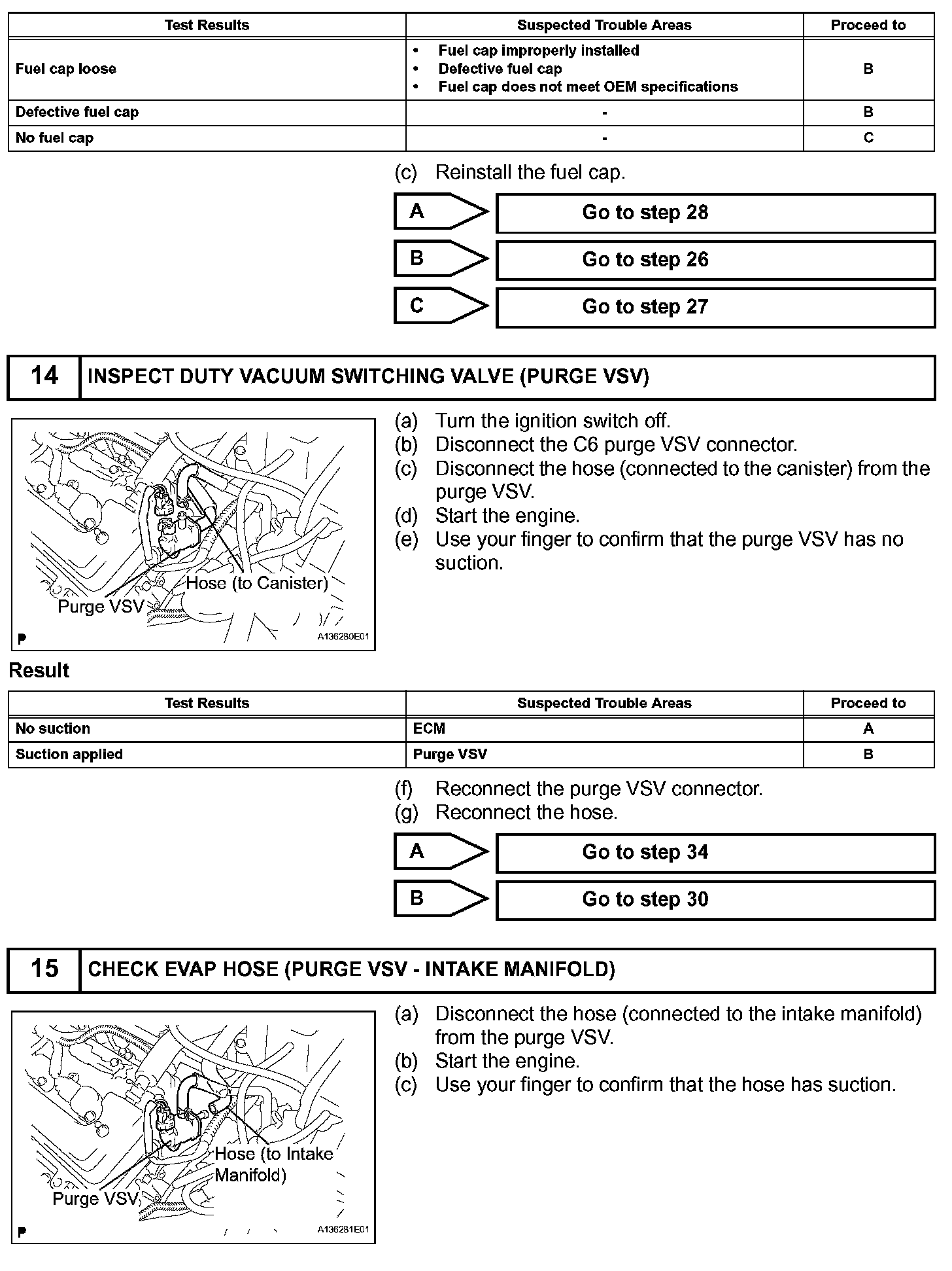 While the engine is running and the purge VSV (Vacuum Switching Valve) is ON (open), the ECM monitors the purge flow by measuring the EVAP pressure change. If negative pressure is not created, the ECM begins the 2nd monitor.