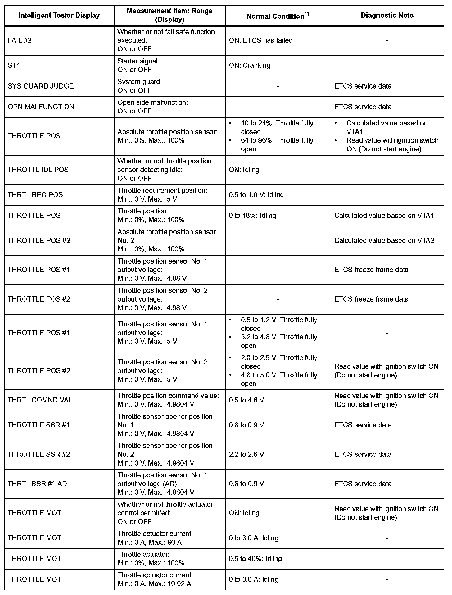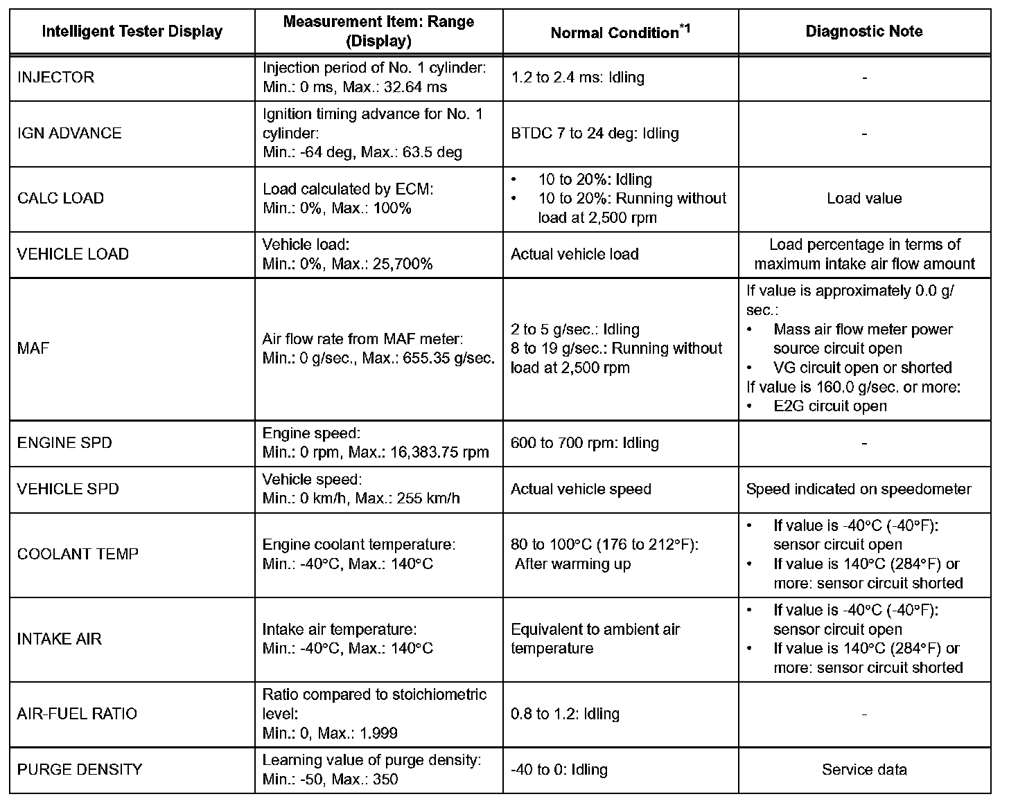 NOTE: In the table, the values listed under Normal Condition are reference only. Do not depend solely on these values when determining whether or not a part is faulty.