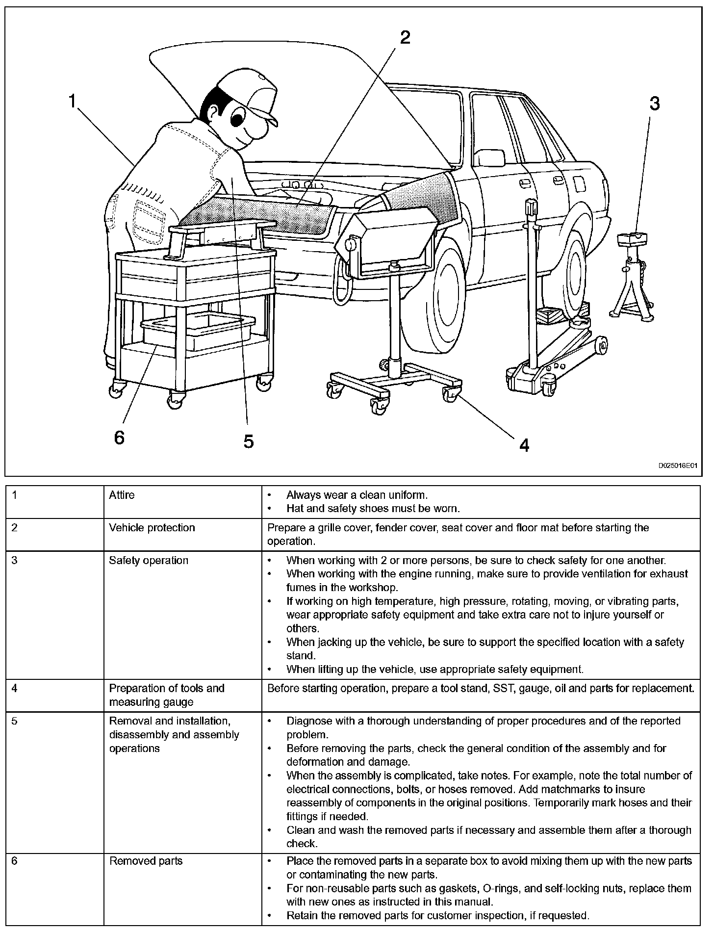 1. Care must be taken when jacking up and supporting the vehicle. Be sure to lift and support the vehicle at the proper locations.