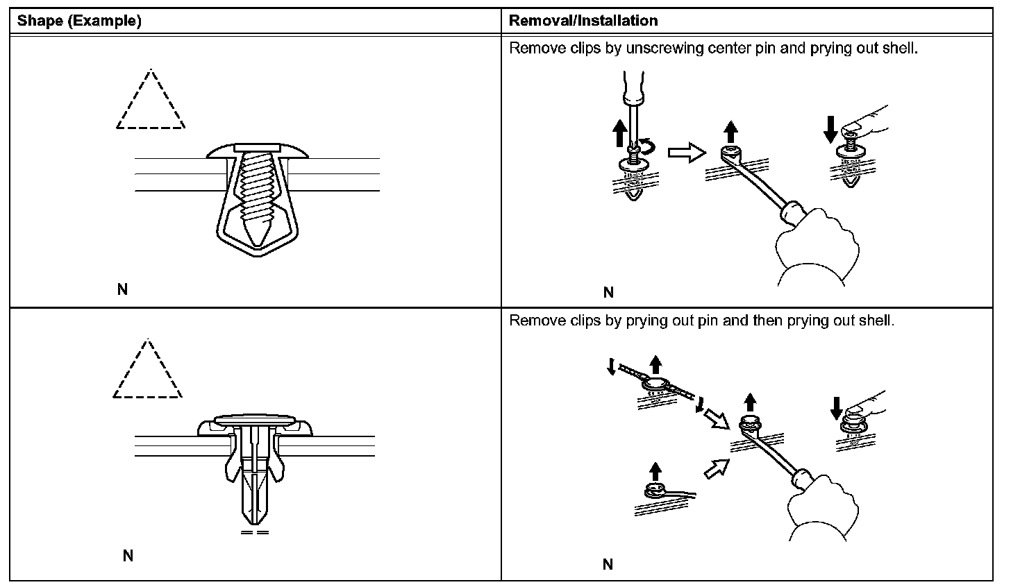 1. The removal and installation methods of typical clips used for vehicle body parts are shown in the table.