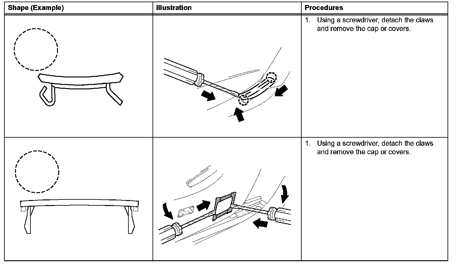 1. The removal and installation methods of typical claws used for vehicle body parts are shown in the table.