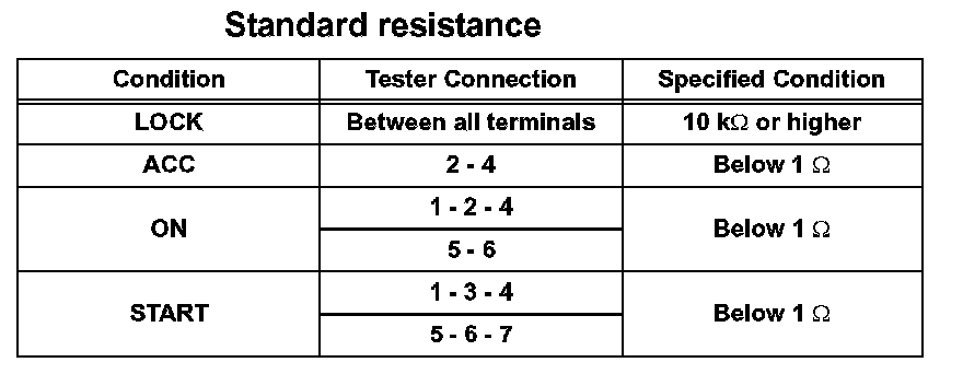 If the result is not as specified, replace the ignition or starter switch.