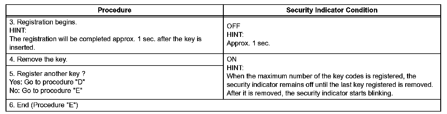 NOTE: If the key code registration has failed in automatic key code registration mode, code 2-1 will be output from the security indicator. Trying to register an already registered key will cause code 2-2 to be output when the key is inserted. If the number of registered key codes exceeds the limit, code 2-3 will be output from the security indicator. The output details are shown in procedure "B".