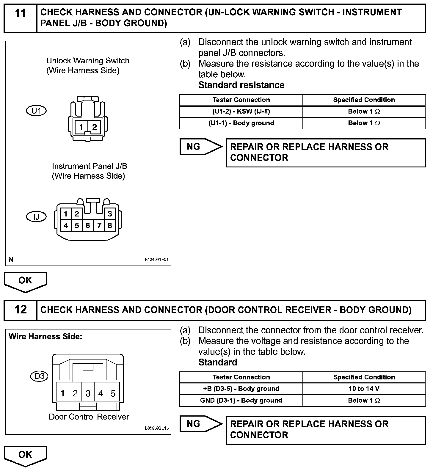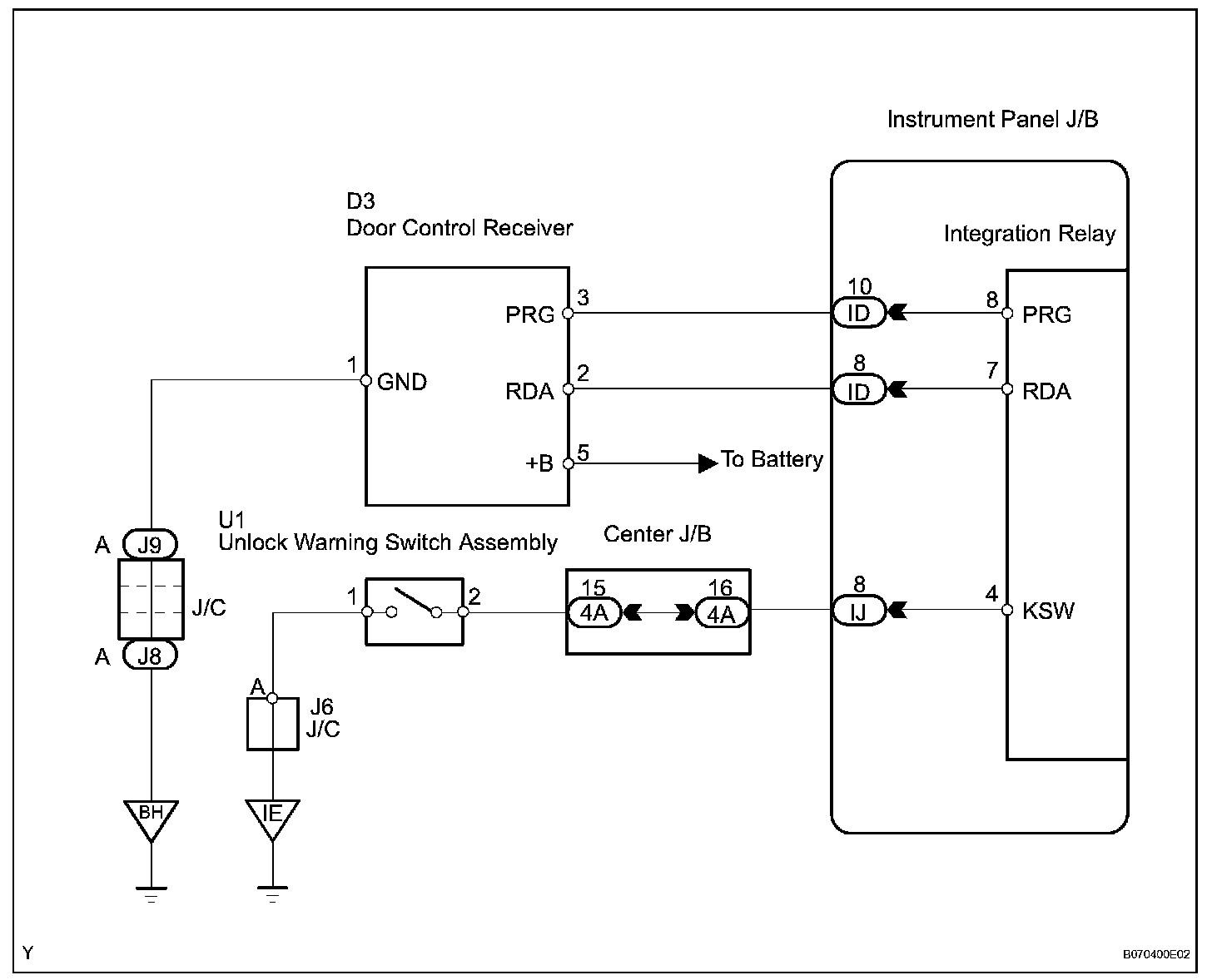 The door control receiver receives a signal from the transmitter and sends this signal to the integration relay. Then, the integration relay controls door operation by sending a door LOCK/UNLOCK signal to each door lock motor.