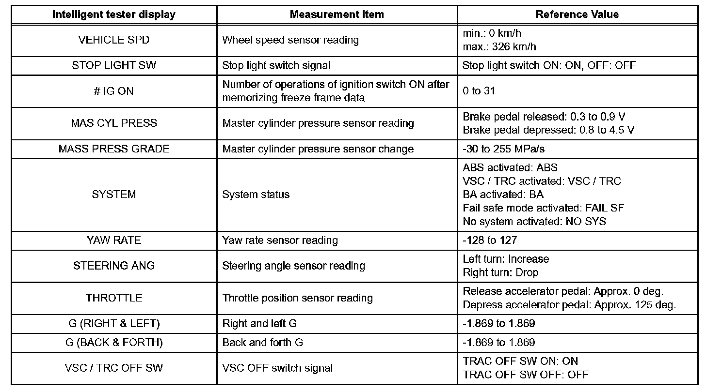 - Freeze frame data at the time the ABS operates: The skid control ECU stores and updates data whenever the ABS system operates.