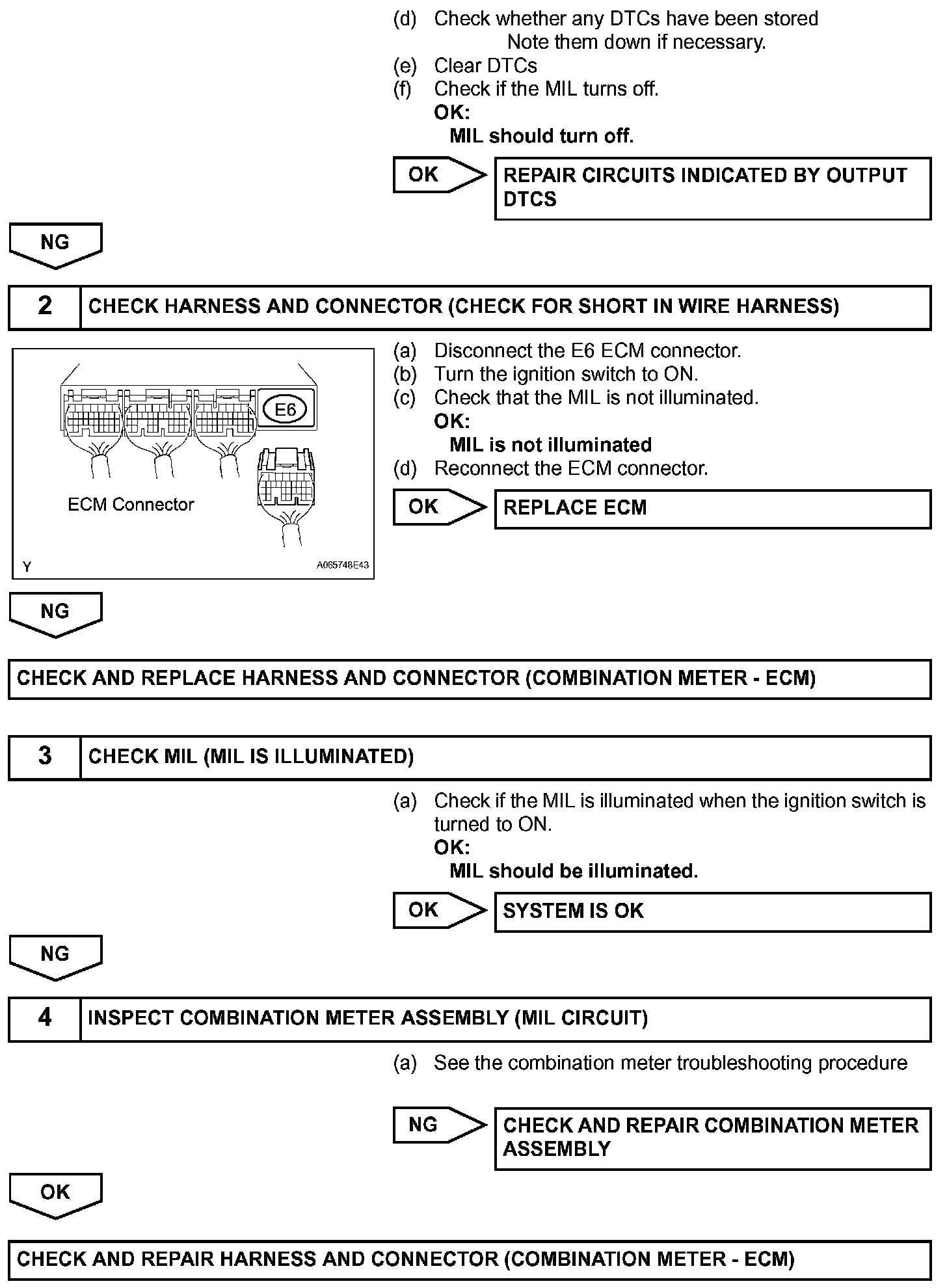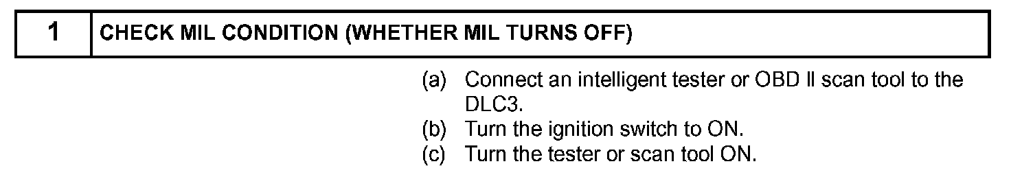 The MIL operation can be checked visually: When the ignition switch is first turned to ON, the MIL should be illuminated and should then turn OFF. If the MIL remains illuminated or is not illuminated, conduct the following troubleshooting procedure using an intelligent tester or OBD II scan tool.