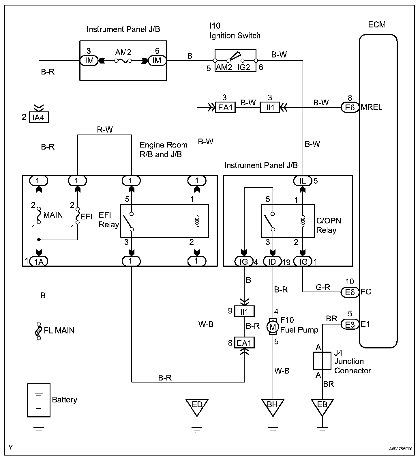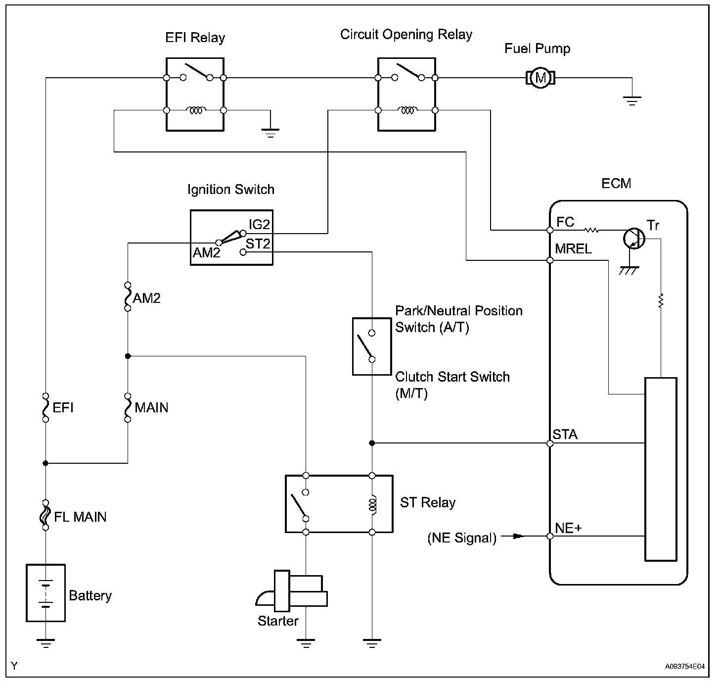 When the STA and NE signals are received by the ECM, Tr (power transistor) is switched on, allowing current to flow into the circuit opening relay coil. The circuit opening relay switches on, power is supplied to the fuel pump and the fuel pump operates.
