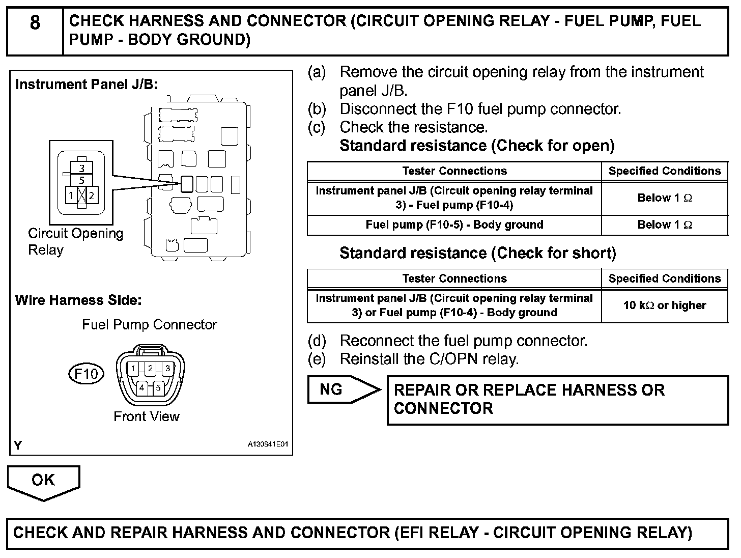 While the NE signal is being generated (engine running), the ECM keeps Tr ON, therefore keeping the circuit opening relay ON, so that the fuel pump continues to operate.