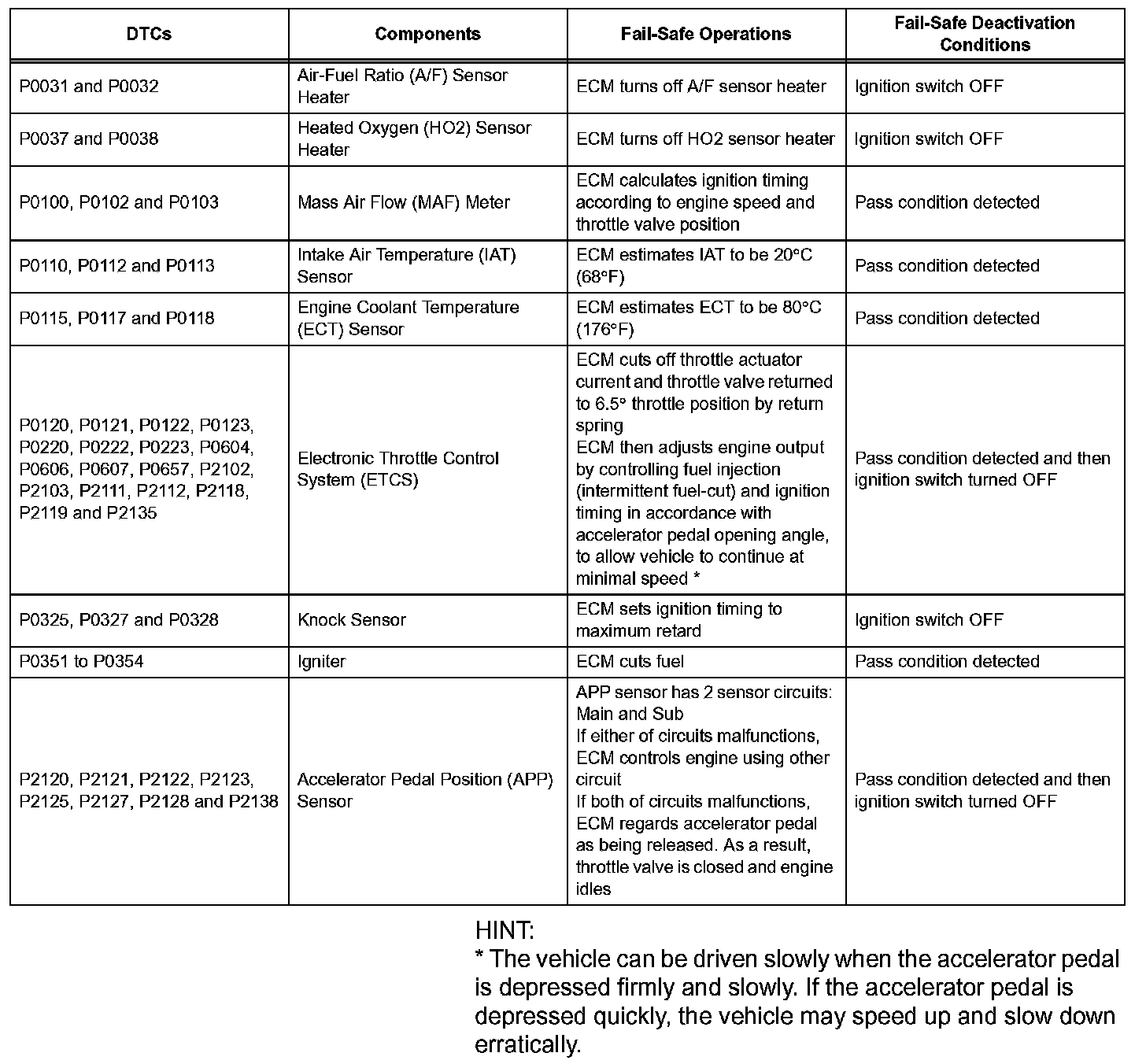 If any of the given DTCs are set, the ECM enters fail-safe mode to allow the vehicle to be driven temporarily.