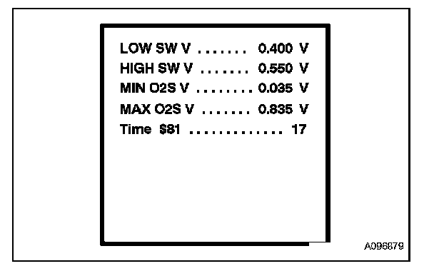 NOTE: Until the HO2 sensor monitor runs to completion, when it fails to complete or when the ignition switch is turned to OFF, the tester screen displays the upper and lower viewable limit values for the monitor (for example, voltages: 0 V and 1.275 V, seconds: 0 and 10.2, and Test Value: 0 and 255).
