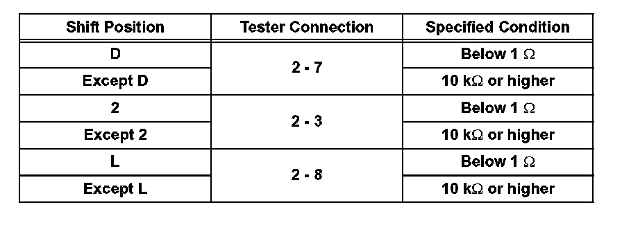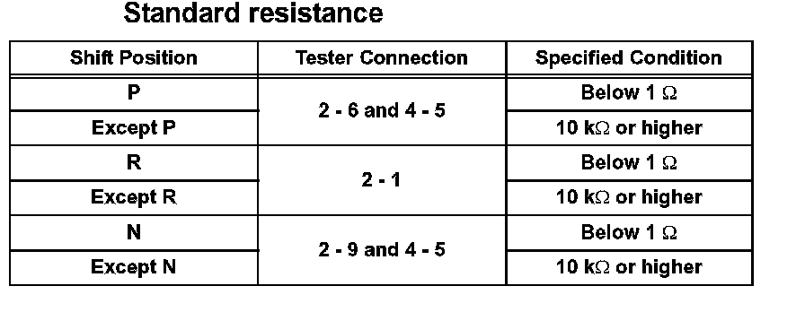(c) Measure resistance according to the value(s) in the table when the shift lever is moved to each position.
