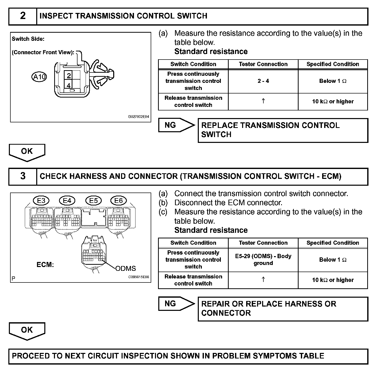 The O/D main switch (transmission control switch) is a momentary type switch. When pressing the O/D main switch, the O/D OFF indicator light lights up and the ECM prohibits shifting into O/D, and when pressing it once again, the O/D OFF indicator light goes off and the ECM allows shifting into O/D. Turning the IG switch OFF will reset the O/D OFF indicator light.