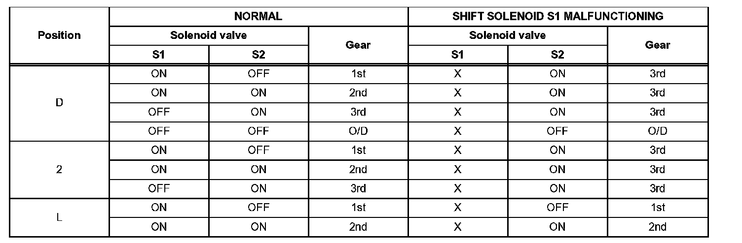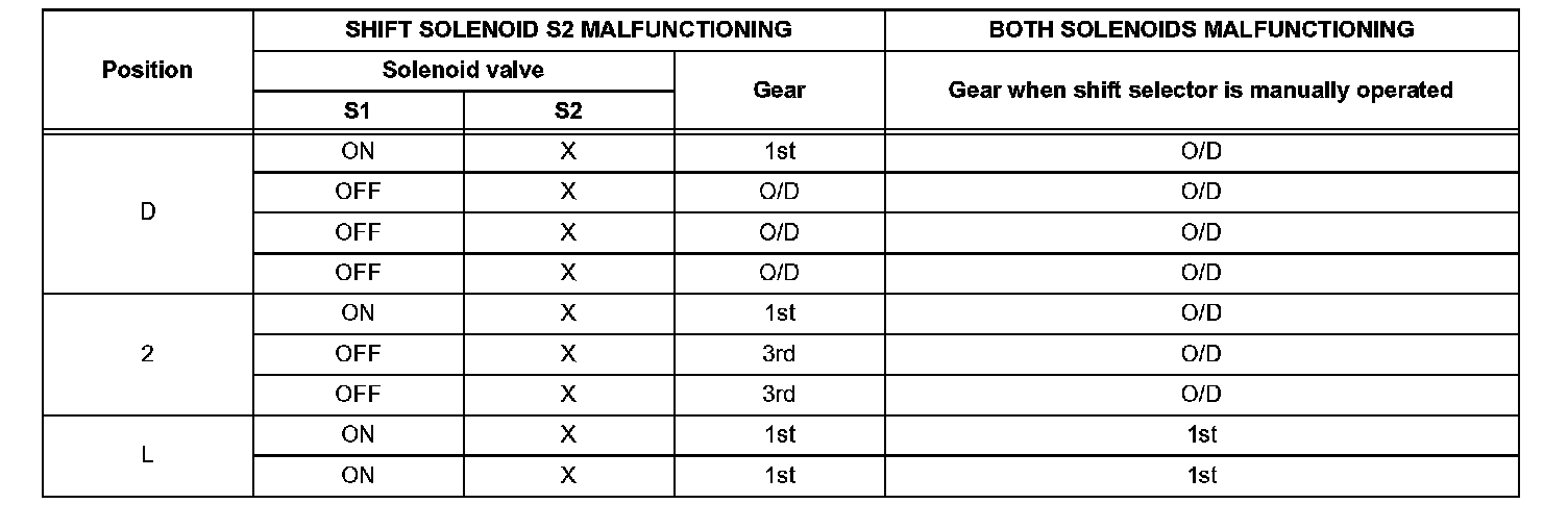 If either of the shift solenoid valve circuits develops an open or short, the ECM turns the other shift solenoid "ON" and "OFF" in order to shift into the gear positions shown in the table.